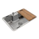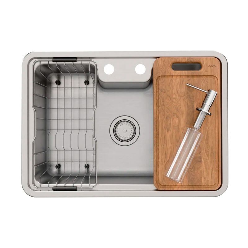 Prática e versátil, a Cuba de Sobrepor ou Embutir Docol Massima 68x48x20 cm em Aço Inox Escovado com Acessórios é garantia de funcionalidade e eficiência na cozinha. Fabricada em aço inoxidável 304 com acabamento escovado, seu desenho inteligente além de oferecer excelente área útil, permite a instalação embutida ou sobreposta. Para garantir maior praticidade também na instalação, a Docol Massima vem com todos os complementos necessários: dispensador de detergente, tábua de corte, cesto aramado, válvula, sifão, tampões de vedação, gabaritos, calços e grampos de fixação, que garantem a montagem perfeita na bancada, tanto para instalação de embutir como de sobrepor.