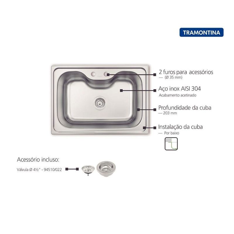 Cuba Tramontina Morgana Undermount 69 X 49 Cm Em Aço Inox Acetinado Com Válvula OutletA praticidade na cozinha é o ponto central para as tarefas diárias ficam mais simples de serem cumpridas. A Cuba Tramontina Morgana 60 FX Undermount em Aço Inox com Acabamento Acetinado com Válvula 69x49 cm vai adicionar muita facilidade à sua vida e se encaixar perfeitamente no espaço que você precisa. Com estrutura de cuba simples produzida em aço inox, ela tem instalação muito fácil, possui 2 furos para torneira e profundidade de 20,3 cm. Seu acabamento acetinado garante muito mais praticidade, pois a torna super fácil de limpar. Um produto pensado para sua cozinha e para te fazer ter muito mais prazer em estar na cozinha!Medidas Internas (Comp. x Larg.) - 60 x 39,7 cmMedidas Externas (Comp. x Larg.) - 68,5 x 48,5 cmFuro para torneira - Sim, 2Acessórios Inclusos - 1 Válvula Luxo 4.1/2Espessura - 0,8 cmAcabamento - AcetinadoAcompanha válvula - SimPosicionamento da válvula - CentralizadaFuração da válvula - 4.1/2Escape/ladrão - NãoAcabamento da válvula - Luxo com pino metalMonobloco - SimAnti-ruído - NãoAceita triturador - SimMais Informações - Instalação: Por baixoCuba: SimplesMaterial:- Aço Inox AISI 304- Espessura: 0,8 mmAcabamento: AcetinadoProfundidade da cuba: 20,3 cmFuro para torneira: Sim, 2.Acessórios inclusos: - 1 Válvula 4 1/2Recomendações de Uso - Remover a etiqueta colada na cuba.Limpar a pia com detergentes normais neutros.Usar somente esponja macia ou pano para lavar.Esta peça contém bordas cortantes. Manusear com cuidado.Não usar ácido muriático, água sanitária ou qualquer outro solvente para lavar objetos.Na reforma ou construção, proteger a pia para não deixar sobre a mesma pó de cimento ou gesso.Enxaguar e secar bem a peça após o uso.Nunca deixar objetos metálicos sobre a peça por períodos muito longos, para evitar a corrosão.Para manter o brilho, recomenda-se o uso da pasta para polir e remover manchas em superfícies de aço inoxidável Tramontina.Garantia de fabricante - 12Principais Características do Produto#0 - Aço Inox 304Principais Características do Produto#2 - Acabamento AcetinadoPrincipais Características do Produto#1 - Acompanha Válvula Luxo de 4.1/2 sem escapeFonte de energia - Não aplicávelOrigem - NacionalNBM/NCM - 73241000Comprimento da embalagem do vendor - 73,5 cmLargura da embalagem do vendor - 54 cmAltura da embalagem do vendor - 25 cmPeso da embalagem do vendor - 5100 gRegulamentações de produtos perigosos - Não aplicávelÉ frágil? - NãoBaterias são necessárias? - NãoNúmero de caixas - 1Número do modelo - OutletTempo de Garantia (Meses) - 12Linha ou Coleção - PrimeModelo - OutletComprimento - 68,5 cmLargura - 48,5 cmAltura - 20,3 cmDimensões do item C x L x A - 68,5x48,5x20,3 cmMaterial - Aço Inox 304Inclui manual de montagem - NãoCor - PrataQuantidade de itens - 1Instruções de cuidados com o produto - Limpeza localCertificação - Não aplicávelGarantia do fabricante - 12 meses para vícios ou defeitos de fabricaçãoPeso do item - 3,6 kgExige montagem - NãoFabricante - TramontinaMarca - Tramontina