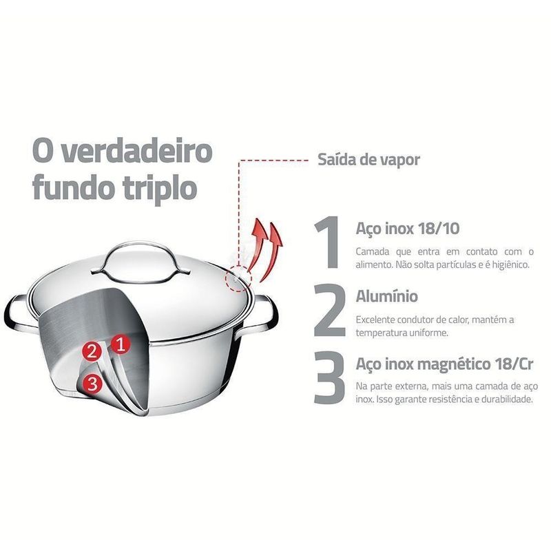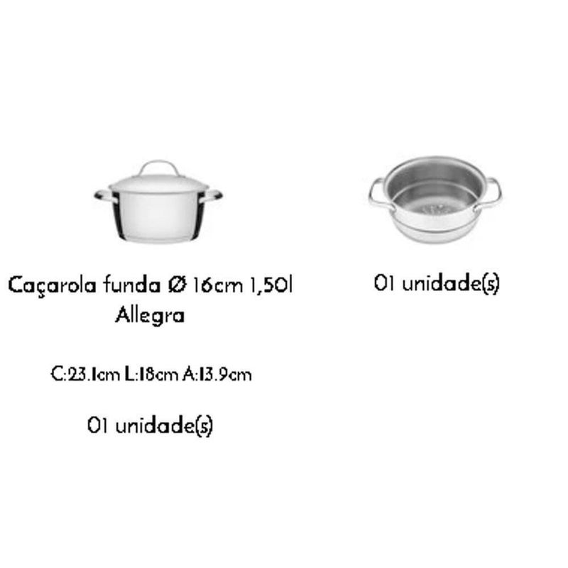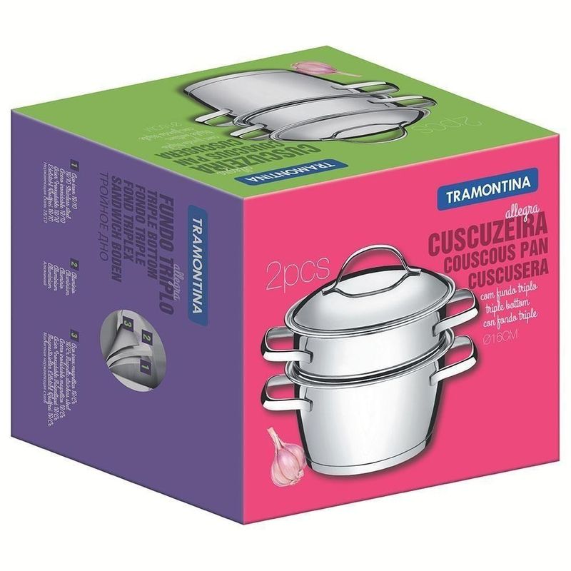 Cuscuzeira Tramontina Allegra Em Aço Inox Com Fundo Triplo 2 Peças 2 L 65650050CUSCUZEIRA TRAMONTINA ALLEGRA EM AÇO INOX COM FUNDO TRIPLO 2 PEÇAS 2 L 65650050Marca: TramontinaModelo: Allegra em Aço Inox com Fundo Triplo 2 Peças 65650/050DESCRIÇÃO DA CUSCUZEIRA TRAMONTINA EM AÇO INOX COM FUNDO TRIPLO- Cuidar dos detalhes é demonstrar carinho.- A Cuscuzeira Tramontina Allegra em Aço Inox com Fundo Triplo 2 Peças da linha Allegra foi criada para tornar mais simples as tarefas de forno e fogão.- O fundo triplo (aço inox + alumínio + aço inox) distribui o calor uniformemente, proporcionando um cozimento mais rápido e uniforme, economizando energia e deixando os alimentos aquecidos por mais tempo.INFORMAÇÕES GERAIS DA CUSCUZEIRA TRAMONTINA EM AÇO INOX COM FUNDO TRIPLO- O design clean da linha Allegra foi criado para tornar mais simples as tarefas de forno e fogão.- Totalmente feitas em aço inox, por isso não solta nenhum resíduo nos alimentos, mantendo-os saudáveis.- Altamente duráveis, mantêm as características originais, preservando a beleza, a higiene e a durabilidade do material.- Possuem design diferenciado e moderno, com acabamento em alto brilho.- Desenho limpo e sem cantos torna a limpeza mais fácil.- Possui tampa com saída de vapor e encaixe perfeito.- Podem ser lavadas diariamente na máquina de lavar louças.- A caçarola pode ser utilizada para outros cozimentos.- Pode ser utilizada nos fogões: elétrico, gás, indução e vitrocerâmico.- A caçarola possui capacidade de 2 até 2 litros.PESO- 0,97 kgDIÂMETRO- 16 cmGARANTIA- 90 dias de garantia legal para vícios ou defeitos de fabricação.DIMENSÕES- Dimensões Embalagem (Compr. X Larg. X Alt.): 19 x 15,5 x 22 cm. cor: prata inox | É kit de fábrica: sim | Quantidade de peças: 2 peças | Adequado para fogão com indução: sim | com revestimento antiaderente: sim | materiais: aço inox | Tipo de panela: Cuscuzeira | Capacidade em volume: 5L | Formato de venda: Unidade | Unidades por kit: 1 | Quantidade de sistemas de segurança: 1 | Tipos de fogões compatíveis: Gás, vitrocerâmico, elétrico, indução | Tipo de revestimento exterior: Aço inox | Tipo de revestimento interior: Aço inox | Tipo de base: Tripla | Material da panela: Aço inox | Com sistema de fechamento automático: Não | Inclui tampa: Sim | Altura: 22 cm | Largura: 15.5 cm | Diâmetro: 16 cm | Peso: 0.97 kg | Linha: Allegra | Material da tampa: Aço inox | Material da alça: Aço inox | Forma: Redondo | É apto para lava-louças: Sim | Dias Entrega Fornecedor: 0 | Cubagem: 0.006688 | Modelo: Allegra | Peso Líquido: 0.9650 | Marca: Tramontina | EmbalagemLargura-cm: 22 | EmbalagemComprimento-cm: 16 | EmbalagemAltura-cm: 19