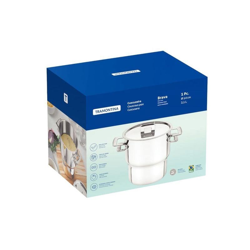 Cuscuzeira Tramontina Brava 14cm 2,1l Em Aço Inox Com TampaPara os apaixonados por cuscuz chegou a Cuscuzeira Tramontina Brava em Aço Inox com Alças e Tampa 2,1 L 14 cm de diâmetro! Perfeita para o preparo dessa deliciosa receita, ela traz toda a beleza e durabilidade do aço inox. Prática e fácil de usar, possui tela perfurada para cozinhar ao vapor e tampa com saída de vapor com encaixe perfeito. Possui capacidade de 2,1 litros e um design moderno que garante bom gosto e estilo para sua cozinha!Linha ou Coleção - BravaComprimento - 21,3 cmLargura - 15,1 cmAltura - 17,8 cmDiâmetro - 14 cmLitragem - 2,1 LComposição - 1 Cuscuzeira Tramontina com tampa;1 Tela perfurada.Quantidade de Peças - 2Material - Aço InoxMaterial da tampa - Aço InoxCor - PrataAcabamento - Alto BrilhoAlças - Aço InoxFundo Triplo - SimInformações Gerais - Totalmente feita de aço inox, por isso não solta nenhum resíduo nos alimentos, mantendo-os saudáveis.Altamente durável, mantém as características originais, preservando a beleza, a higiene e a durabilidade do material.Possui design diferenciado e moderno, com acabamento em alto brilho.Desenho limpo e sem cantos torna a limpeza mais fácil.Possui tampa com saída de vapor e encaixe perfeito.Peso - 0.5 kgPode ser utilizada nos fogões - Gás, elétrico, e vitrocerâmico.Garantia do fabricante - 3 meses para vícios ou defeitos de fabricaçãoPrincipais Características do Produto#0 - Totalmente feita de aço inox, por isso não solta nenhum resíduo nos alimentos, mantendo-os saudáveis.Principais Características do Produto#2 - Altamente durável, mantém as características originais, preservando a beleza, a higiene e a durabilidade do material.Principais Características do Produto#1 - Possui design diferenciado e moderno, com acabamento em alto brilho. Desenho limpo e sem cantos torna a limpeza mais fácil.Fonte de energia - Gás elétricoOrigem - NacionalNBM/NCM - 73239300Comprimento da embalagem do vendor - 22 cmLargura da embalagem do vendor - 16 cmAltura da embalagem do vendor - 17 cmPeso da embalagem do vendor - 700 gRegulamentações de produtos perigosos - Não aplicávelÉ frágil? - NãoBaterias são necessárias? - NãoNúmero de caixas - 1Número do modelo - 62419140Dimensões do item C x L x A - 21,3x15,1x17,8 cmQuantidade de itens - 1Instruções de cuidados com o produto - Seguro para lava-louçasCertificação - 001470/2018Fabricante - Tramontina