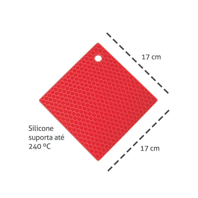 Descanso de panela quadrado de silicone. Suporte foi fabricado em silicone de qualidade, duravel e perfeito para o dia a dia. Proteja sua mesa ou toalhas com o descanso de panela evitando que queime ao entrar em contato direto com panelas quentes. Resiste a temperaturas de ate 220ºC. Contem: 2 DescansoS de Panela Dimens›es: 17 x 17 cm Material: Silicone