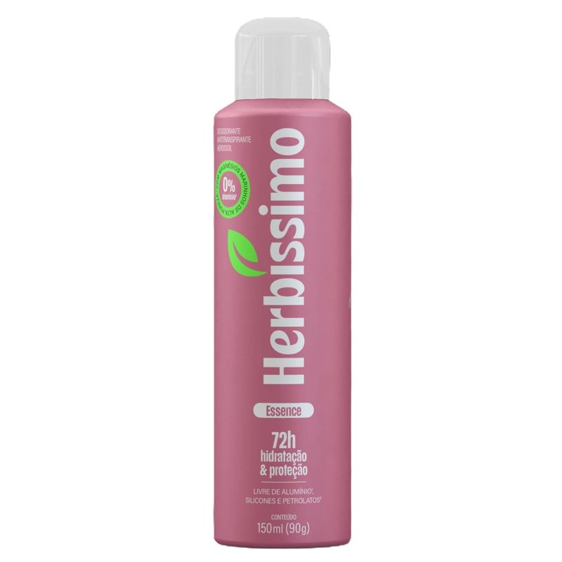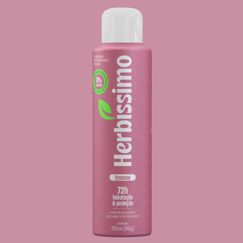 Desodorante Antitranspirante Aerosol Herbíssimo Zero Alumínio Essence 150ml O que é e para que serve o Aerosol Herbíssimo Zero Alumínio Essence? O Desodorante Antitranspirante Aerosol Herbíssimo Zero Alumínio Essence 150ml oferece até 72 horas de hidratação e proteção, garantindo cuidado prolongado para as axilas com uma fórmula leve e eficaz. Desenvolvido para quem busca proteção confiável contra o suor e o mau odor, sem abrir mão de uma composição mais suave. Com a fragrância Essence, proporciona sensação de frescor duradouro e conforto ao longo do dia, mantendo as axilas protegidas e agradavelmente perfumadas. Benefícios e Diferenciais 72h de Proteção: Eficácia prolongada contra suor e odores. Zero Alumínio: Livre de sais de alumínio. Sem Silicones e Petrolatos: Fórmula mais leve para o uso diário. Hidratação Prolongada: Mantém a pele das axilas macia e cuidada. Fragrância Essence: Perfume marcante e sofisticado. Secagem Rápida: Toque seco e confortável. Modo de Uso Agite bem antes de usar. Aplique o aerosol diretamente nas axilas limpas e secas, mantendo uma distância aproximada de 15 cm da pele. Aguarde a secagem completa antes de se vestir. Composição e Tecnologia Com fórmula livre de alumínio, silicones e petrolatos, o Desodorante Herbíssimo Zero Alumínio Essence combina tecnologia antitranspirante com ativos que promovem hidratação e conforto, proporcionando proteção eficaz com cuidado diário.