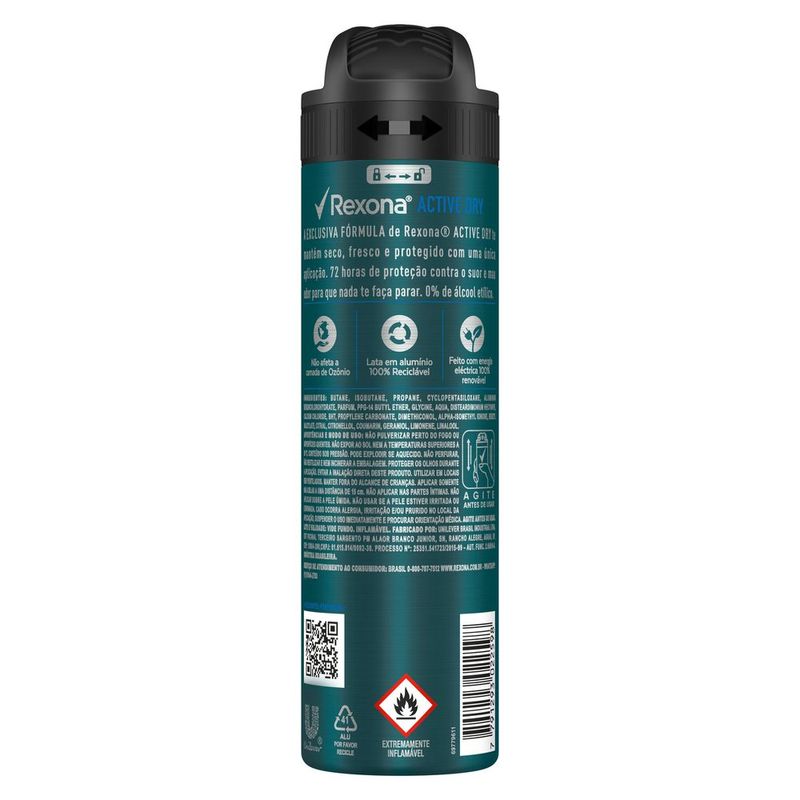 Desodorante Rexona Masculino Active Dry 150ml• A exclusiva fórmula do Desodorante Antitranspirante Aerosol Masculino Rexona Active Dry garante 72 horas de proteção contra o suor e o mau odor ativado pelo movimento • O desodorante Active Dry o mantém seco, refrescado e protegido para que nada o detenha • Antitranspirante masculino fácil de usar: agite e aplique nas axilas a não menos de 15 cm da pele • Esse antitranspirante contém uma fragrância refrescante e sensação de frescor durante o dia todo • Esse desodorante antitranspirante não contém álcool* e não afeta a camada de ozônio, sua lata é de alumínio 100% reciclável, feito com energia elétrica 100% renovável • O Desodorante Aerosol Masculino Rexona Active Dry permite que você fique sempre protegido, não importa o que aconteça. Rexona não te abandona Mais uma vez Rexona se supera e relança sua linha de desodorantes com uma fórmula inovadora, o Desodorante Antitranspirante Aerosol Masculino Rexona Active Dry combina um novo e exclusivo ativo antitranspirante com a tecnologia de fragrâncias encapsuladas. Esse desodorante o mantém protegido por até 72 horas, ativado pelo seu movimento e o deixa muito mais confiante para encarar qualquer desafio. Com o registro de 16 patentes e mais de 300 testes técnicos, está comprovado que essa nova tecnologia antitranspirante entrega um nível de proteção contra o suor como nenhuma outra proposta regular já entregou antes. A nova e exclusiva fórmula de Rexona Active Dry trabalha com um sistema de partículas menores e mais estáveis que formam uma barreira protetora mais resistente e duradoura contra a transpiração e o mau odor, mantendo você seco, refrescado e protegido a cada novo movimento e por muito mais tempo. Esse desodorante contém uma fragrância refrescante e sensação de frescor durante o dia todo. A lata usada no desodorante é feita de alumínio 100% reciclável, e o produto é feito com energia elétrica 100% renovável, não contém álcool* e não afeta a camada de ozônio. Experimente também outros produtos da linha de desodorantes aerosol Rexona e se sinta sempre protegido durante qualquer atividade, porque Rexona não te abandona! *Não contém álcool etílico