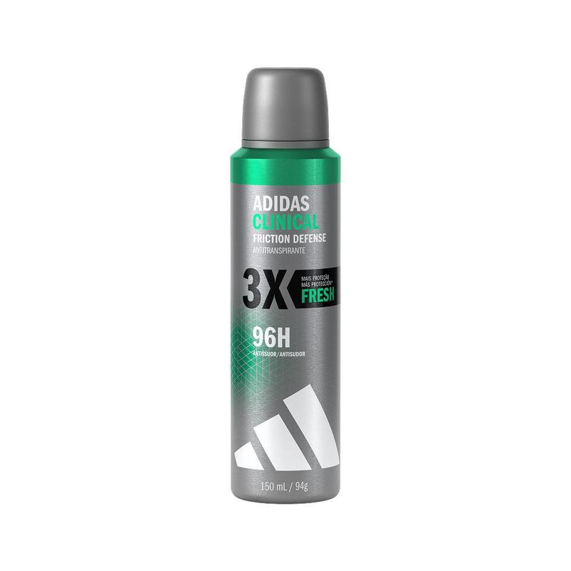 Desodorante Antitranspirante Aerossol Adidas Clinical Friction Defense Fresh Masculino 150ml Proteção clínica com sensação refrescante e duradoura para homens que vivem em alta performance! O Desodorante Antitranspirante Adidas Clinical Friction Defense Fresh Masculino 150ml oferece até 96 horas de proteção intensa contra suor e odor, com uma fragrância revigorante que garante frescor prolongado. Formulado com tecnologia avançada, este desodorante ajuda a prevenir o atrito nas axilas, proporcionando maior conforto mesmo durante atividades físicas intensas ou em dias de calor extremo. Sua ação antitranspirante seca rapidamente e mantém a pele protegida e com toque seco. Ideal para homens que praticam esportes, treinam regularmente ou enfrentam rotinas exigentes, o Adidas Clinical Fresh garante confiança e bem-estar por muito mais tempo, sem necessidade de reaplicações frequentes. Benefícios Até 96 horas de proteção contra suor e odor; Previne atrito e desconforto nas axilas; Fragrância Fresh energizante e refrescante; Secagem rápida e toque seco imediato; Ideal para treinos, esportes e rotina intensa; Aplicação prática em spray aerossol. Modo de Uso Agite bem antes de usar. Aplique nas axilas limpas e secas, a uma distância de cerca de 15cm. Use diariamente para garantir proteção contínua e sensação de frescor. Precauções e Advertências Uso externo. Não aplicar sobre pele irritada ou lesionada; Evite contato com os olhos. Em caso de irritação, suspenda o uso; Produto inflamável. Mantenha longe do fogo e calor excessivo; Não perfurar ou incinerar mesmo vazio; Mantenha fora do alcance de crianças.