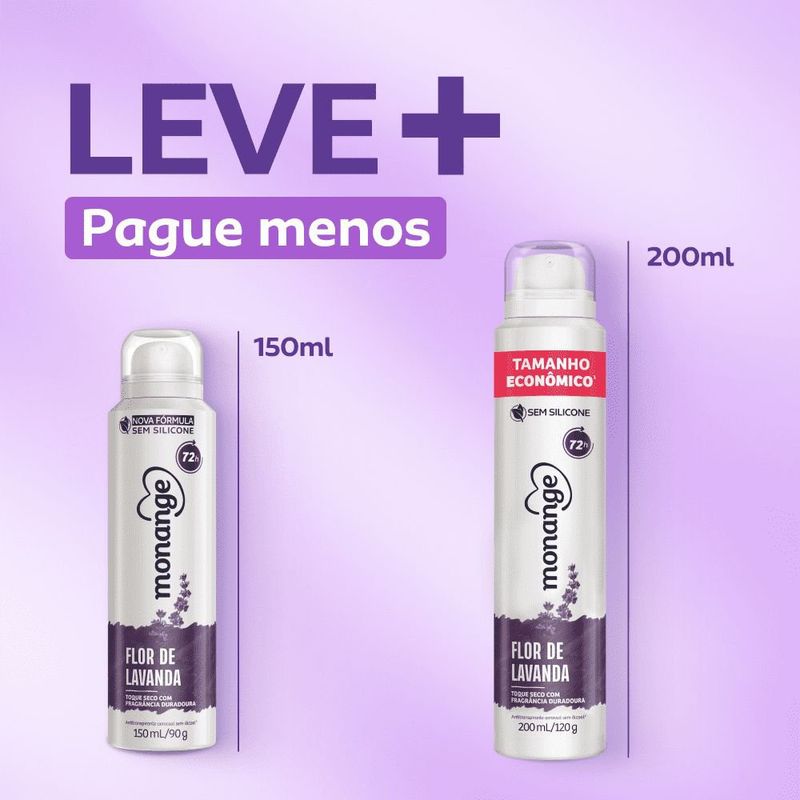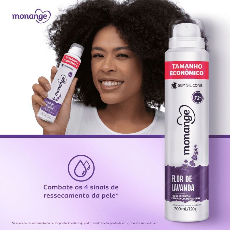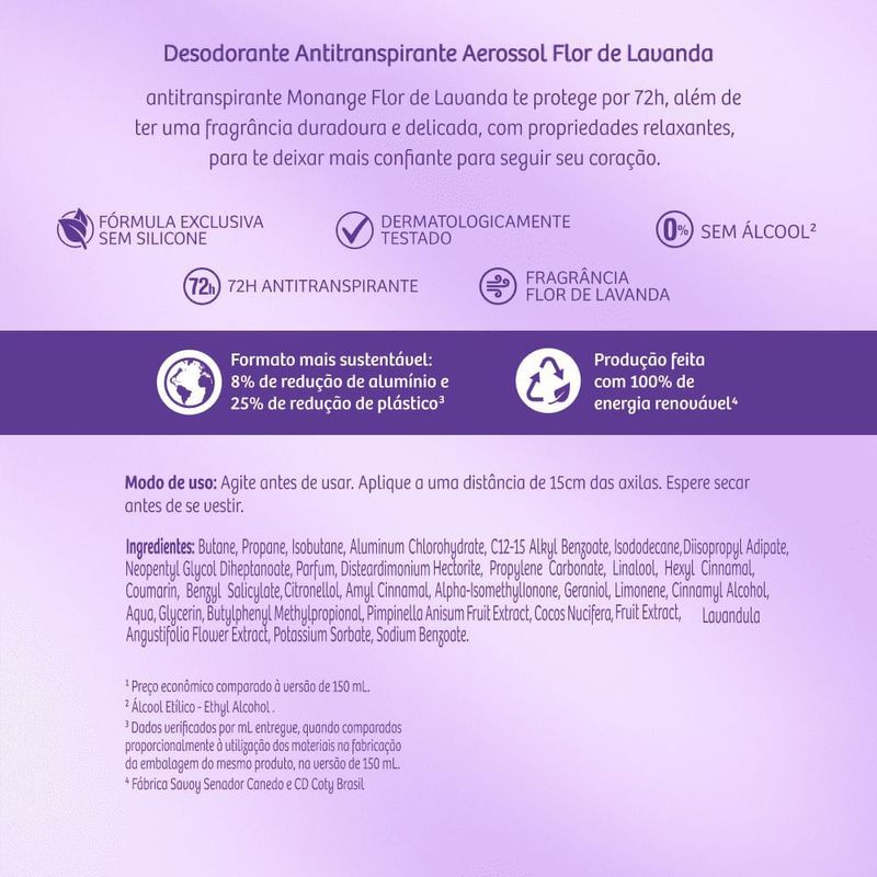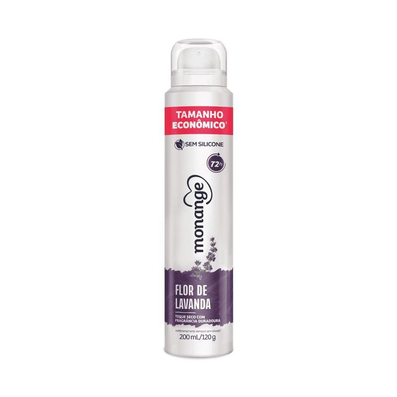 Desodorante Antitranspirante Aerossol Monange Flor de Lavanda 200ml Delicadeza e proteção com o toque suave da lavanda! O Desodorante Antitranspirante Aerossol Monange Flor de Lavanda 200ml oferece até 72 horas de proteção eficaz contra suor e mau odor, mantendo a pele perfumada com uma fragrância floral calmante e agradável ao longo do dia. Sua fórmula foi desenvolvida para proporcionar conforto e cuidado diário, sendo enriquecida com agentes hidratantes que ajudam a manter a pele das axilas suaves e protegidas. O perfume de lavanda traz uma sensação de frescor, tranquilidade e bem-estar, ideal para mulheres que valorizam fragrâncias delicadas e uma proteção confiável. Com embalagem prática em aerossol de 200ml, é perfeito para usar em casa, no trabalho ou na bolsa, garantindo confiança e segurança o dia todo. Benefícios Proteção antitranspirante por até 72 horas; Fragrância suave e relaxante de flor de lavanda; Ajuda a manter a pele hidratada e macia; Fórmula que seca rapidamente e não mancha as roupas; Ideal para todos os tipos de pele; Embalagem econômica com 200ml. Modo de Uso Agite bem antes de usar. Aplique o desodorante nas axilas limpas e secas, mantendo uma distância de cerca de 15cm da pele. Espere secar antes de se vestir. Precauções e Advertências Uso externo. Não aplicar sobre a pele irritada ou lesionada; Evite inalar o produto ou aplicar próximo aos olhos; Conteúdo inflamável. Mantenha longe do fogo e de superfícies aquecidas; Não perfurar a embalagem mesmo após o uso; Conservar fora do alcance de crianças.