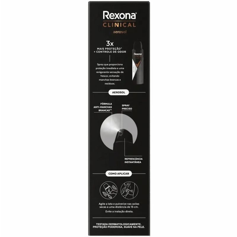 Desodorante Antitranspirante Aerossol Rexona Clinical Invisible Men 150ml Proteção máxima e frescor prolongado para o seu dia a dia! O Desodorante Rexona Clinical Invisible Men oferece até 96 horas de proteção antitranspirante, mantendo você seguro contra o suor e os maus odores em qualquer situação. Sua fórmula avançada foi desenvolvida especialmente para homens modernos que buscam eficácia, praticidade e confiança, sem abrir mão do cuidado com as roupas. Com 150ml, o desodorante aerossol proporciona aplicação uniforme e confortável. Além de garantir a máxima eficácia da linha Rexona Clinical, ele conta com uma fragrância sofisticada que deixa sensação de frescor prolongado, enquanto sua tecnologia exclusiva ajuda a prevenir manchas brancas e amarelas em roupas claras e escuras. Benefícios Proteção antitranspirante eficaz por até 96 horas; Fórmula que ajuda a prevenir manchas em roupas claras e escuras; Aplicação prática em aerossol; Fragrância sofisticada e fresca por mais tempo; Máxima confiança da linha Rexona Clinical. Modo de Uso Agite bem antes de usar. Aplique diretamente nas axilas a uma distância de 15cm, em jatos curtos e uniformes. Reaplique se necessário para manter a proteção durante todo o dia. Conservação Conservar em local fresco e seco; Não expor a temperaturas superiores a 50°C; Uso externo. Manter fora do alcance de crianças. Descrição do Fabricante O Desodorante Antitranspirante Aerosol Rexona Clinical Invisible Men garante 96h de proteção com fórmula antimanchas • Possui uma fórmula com 3x mais proteção* contra o suor e controle de odor que um antitranspirante comum • Desenvolvido com microtecnologia Pro-Defense, que previne o suor, neutraliza o mau odor e refresca • Rexona Clinical Invisible Men é dermatologicamente testado, e por isso gentil com a pele • Este desodorante possui uma ótima fragrância suave para você se sentir confiante e fresco o dia todo • O spray preciso deste antitranspirante aerossol fornece proteção imediata e uma revigorante sensação de frescor Descubra a proteção poderosa e rigorosa do Rexona Clinical Aerosol Invisible Men, o desodorante desenvolvido para quem precisa de desempenho máximo no dia a dia. Com 96 horas de proteção antitranspirante, ele proporciona uma sensação refrescante, mesmo nos momentos mais intensos. Sua fórmula exclusiva oferece 3x mais proteção* contra o suor em comparação com um antitranspirante comum, além de controlar o mau odor. Com a avançada microtecnologia Pro-Defense, a Rexona Clinical atua junto ao seu corpo com uma resposta de tripla ação. Ele previne o suor com nosso ativo antitranspirante mais potente, neutraliza o mau odor liberando mais princípios ativos conforme o movimento, e refresca com moléculas de fibras ativadas pelo suor – garantindo que você se sinta limpo, fresco e protegido durante todo o dia, mesmo sob calor, estresse ou exercício físico. Com formulação antimanchas, este desodorante antitranspirante aerossol foi especialmente desenvolvido para ajudar a prevenir manchas brancas de resíduos em roupas escuras e manchas amarelas em roupas claras. Além disso, é dermatologicamente testado, sendo eficaz e suave na pele. Suas fragrâncias suaves e amadeiradas, com notas de cedro, bergamota e baunilha são liberadas de forma contínua graças às cápsulas de liberação controlada, mantendo você fresco e confiante o dia todo. O spray preciso garante uma aplicação uniforme e uma sensação de frescor instantâneo. Para melhores resultados, agite bem antes de usar e aplique nas axilas secas a uma distância de 15 cm. A aplicação noturna também é recomendada: a fórmula é ativada enquanto você dorme, entregando proteção ao longo do dia seguinte. *Vs um antitranspirante básico.
