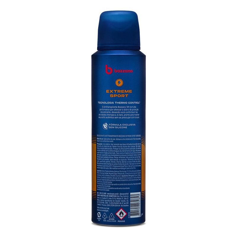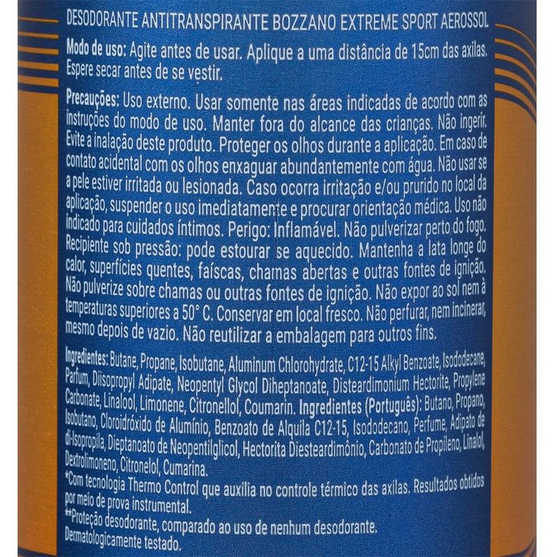 O que é o Bozzano Extreme e para que serve? O Bozzano Extreme é um desodorante masculino em formato aerossol, desenvolvido para garantir uma sensação de frescor e conforto durante o dia todo. Sua fórmula inovadora conta com a tecnologia Thermo Control, que ajuda no controle térmico das axilas, prevenindo a transpiração e o mau odor, e oferecendo proteção eficaz por até 72 horas, mesmo com variações de temperatura externa. Como usar o Desodorante Bozzano Extreme Aerosol? Antes de usar, agite bem o frasco e aplique o produto a uma distância de aproximadamente 15 cm das axilas. Deixe o produto secar antes de vestir a roupa. Caso a válvula não funcione corretamente, vire o frasco para baixo e agite novamente. Benefícios e diferenciais Tecnologia Thermo Control, que regula a temperatura das axilas e combate o suor e o mau odor.Proteção duradoura por até 72 horas.Sensação de frescor e conforto durante o dia.Fórmula sem álcool, suave para a pele. Composição Butano, Isobutano, Propano, Ciclometicona, Cloridrato de Alumínio, Perfume, Diisopropil Adipato, Dimeticona, Disteardimônio Hectorite, Lauril Glucosídeo, Poligliceril-2 Dipolihidroxiestearato, Carbonato de Propileno, Glicerina, 2-Metil 5-Ciclohexilpentanol, BHT, Linalool, Limoneno, Citronelol, Cumarina. Advertências Uso exclusivo para as axilas.Não aplique sobre pele irritada ou lesionada.Em caso de irritação ou coceira, suspenda o uso imediatamente e procure orientação médica.Evite inalar o produto.Proteja os olhos durante a aplicação.Perigo: aerossol altamente inflamável.Recipiente sob pressão: risco de explosão quando exposto ao calor.Mantenha o produto longe de calor, superfícies quentes, faíscas, chamas abertas e outras fontes de ignição. Não fume enquanto estiver utilizando o produto.Não perfure, incinere ou queime a embalagem, mesmo após o uso.Não exponha o produto ao sol ou a temperaturas superiores a 50ºC.A embalagem vazia pode ser reciclada.Caso haja contato com os olhos, lave-os imediatamente com água abundante.Armazene o produto em local fresco, seco e ao abrigo da luz intensa.Mantenha fora do alcance de crianças.