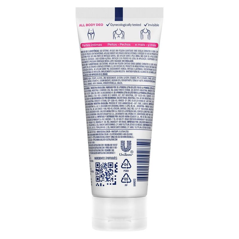 Desodorante Corporal Rexona Creme All Body Deo Wild Rose 75g Proteção intensa, cuidado com a pele e fragrância floral marcante! O Desodorante Rexona Creme All Body Deo Wild Rose 75g combina alta performance antitranspirante com uma fragrância sofisticada de rosa selvagem. Com textura cremosa e toque seco, ele é perfeito para quem deseja proteção eficaz com conforto e hidratação, podendo ser aplicado em diversas áreas do corpo, como axilas, pescoço, colo e costas. Sua fórmula é dermatologicamente testada e desenvolvida para oferecer até 72 horas de proteção contra o suor e o mau odor, sem agredir a pele. A fragrância Wild Rose traz notas florais envolventes, proporcionando uma sensação duradoura de frescor, leveza e elegância ao longo do dia. Ideal para o uso diário, o Rexona All Body em creme é indicado para todos os tipos de pele e conta com embalagem prática de 75g, sendo uma excelente opção para quem busca versatilidade, desempenho e perfumação prolongada em um só produto. Benefícios Proteção antitranspirante por até 72 horas; Fragrância floral sofisticada de Wild Rose; Textura cremosa com toque seco e absorção rápida; Pode ser usado em diferentes partes do corpo (All Body); Ideal para peles sensíveis, com ação suave e hidratante; Fácil de aplicar e não mancha a roupa. Modo de Uso Aplique uma pequena quantidade do desodorante diretamente sobre a pele limpa e seca nas axilas ou em outras áreas do corpo desejadas. Espalhe suavemente até total absorção. Reaplique sempre que necessário para manter a proteção e a fragrância. Precauções e Advertências Uso externo. Não aplicar sobre a pele lesionada ou irritada; Evitar o contato com os olhos. Em caso de contato, enxaguar com água abundante; Manter fora do alcance de crianças e animais domésticos; Em caso de irritação, suspender o uso e procurar orientação médica; Conservar em local fresco, seco e ao abrigo da luz solar.