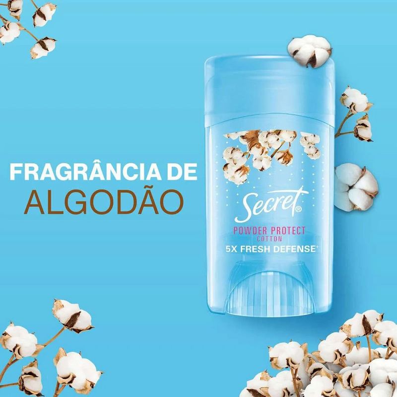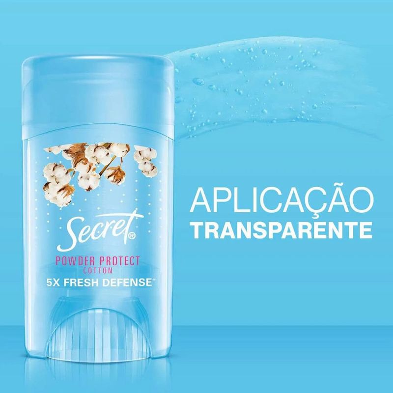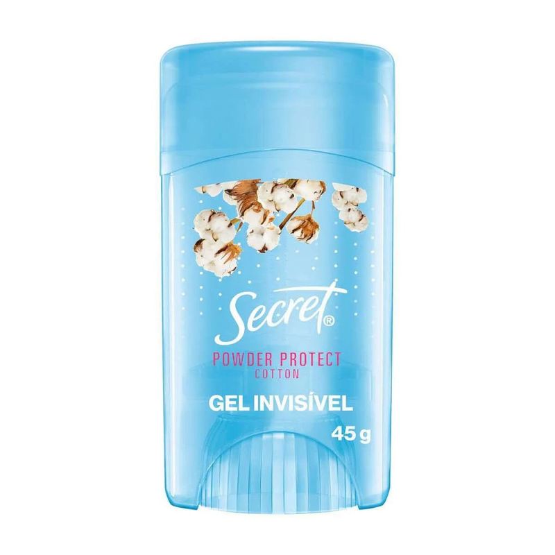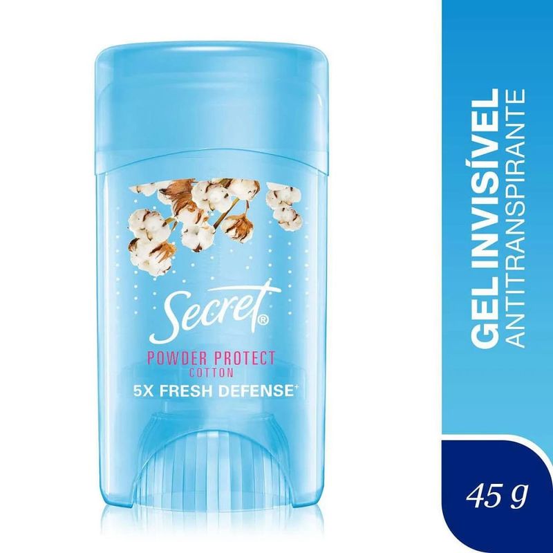 Desodorante Gel Stick Secret Powder Protect Cotton 45g O que é o Desodorante Secret Powder Protect Cotton Gel Stick? O Desodorante Secret Powder Protect Cotton Gel Stick 45g é a escolha ideal para quem busca proteção eficaz contra o mau odor e sensação prolongada de frescor. Com fórmula em gel invisível, ele combate o suor e as bactérias responsáveis pelos odores, oferecendo até 48 horas de proteção. Para que serve? Indicado para o controle do suor e odores nas axilas, o desodorante Secret protege a pele e mantém a sensação de limpeza, conforto e frescor ao longo do dia, sem deixar resíduos ou manchas nas roupas. Como funciona? Sua tecnologia exclusiva detecta o mau cheiro e o bloqueia de forma inteligente, agindo diretamente contra o acúmulo de bactérias. A fórmula em gel seca rapidamente, sem deixar a pele pegajosa. Benefícios 48h de proteção contra o mau odor Não mancha roupas claras ou escuras Sensação de frescor prolongado Textura gel invisível de rápida absorção Ideal para levar na bolsa ou mochila Embalagem prática com lacre de segurança Como usar? Retire o lacre de segurança. Gire a base até o produto aparecer. Aplique nas axilas limpas e secas. Feche bem após o uso. Advertências Uso externo e exclusivo nas axilas Não aplicar em pele irritada ou lesionada Em caso de irritação, suspender o uso Evitar contato com os olhos Manter fora do alcance de crianças