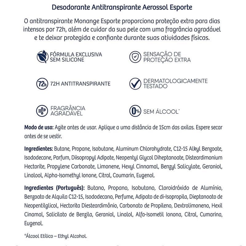 Desodorante Aerosol Monange Esporte: Proteção e Conforto Para o Seu Dia a Dia O Desodorante Antitranspirante Monange Esporte foi desenvolvido para oferecer até 72 horas de proteção eficiente contra o suor. Sua fórmula inovadora, sem silicone e com 0% de álcool, proporciona uma sensação de frescor prolongado, mesmo nos dias mais intensos e nas rotinas mais agitadas. Com uma fragrância delicada que mistura notas florais e cítricas, o Monange Esporte mantém você confiante e energizado, especialmente durante as atividades físicas, garantindo uma sensação de bem-estar constante. Como Aplicar o Desodorante Aerosol Monange Esporte? Agite bem antes de usar.Aplique o produto a uma distância de cerca de 15 cm das axilas.Deixe secar completamente antes de se vestir. Advertências e Cuidados Uso exclusivo nas axilas.Produto de uso externo.Perigo: inflamável. Não aplicar perto de fontes de calor ou fogo.Evite perfurar ou incinerar a embalagem.Não utilizar em áreas da pele irritadas ou lesionadas.Não inale o produto e proteja os olhos durante a aplicação.Em caso de contato com os olhos, enxágue imediatamente com água abundante.Se houver qualquer sinal de irritação ou prurido, suspenda o uso e procure orientação médica.Mantenha o produto longe da luz solar direta e não o exponha a temperaturas acima de 50ºC.Apenas a embalagem vazia pode ser reciclada.Nunca ingira o produto e mantenha fora do alcance das crianças.