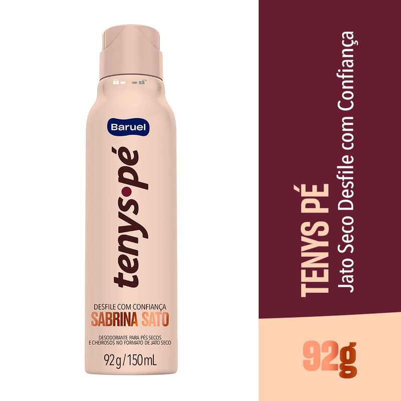 Desodorante para Pés Tenys Pé Baruel Jato Seco Sabrina Sato 150ml O Desodorante para Pés Tenys Pé Baruel Jato Seco Sabrina Sato foi desenvolvido para mulheres que desejam conforto, frescor e proteção diária contra o mau odor. Sua fórmula com ação antisséptica combate até 99% de fungos e bactérias, mantendo os pés secos, saudáveis e perfumados ao longo do dia. Benefícios do Desodorante para Pés Ação antisséptica eficaz contra fungos e bactérias. Rápida absorção sem deixar resíduos. Elimina odores indesejáveis nos pés. Previne frieiras e micoses. Proteção de até 24 horas. Dermatologicamente testado. Fórmula livre de alumínio. Ideal para atividades esportivas. Produto vegano e cruelty-free. Uso diário seguro e confortável. Como Usar o Tenys Pé Jato Seco? Agite bem antes de aplicar. Borrife a cerca de 15 cm dos pés. Aguarde a secagem completa antes de calçar meias ou sapatos. Resultados Garantidos Com o jato seco de absorção imediata, o desodorante para pés Tenys Pé garante proteção, frescor e perfumação durante todo o dia, promovendo mais segurança e confiança em qualquer ocasião. Fórmula e Ingredientes Butano, Isobutano, Propano, Álcool Etílico, Palmitato de Isopropila, Perfume, Decametilciclopentasiloxano, Decilenoglicol, Limoneno, Linalol, Alfa-Isometil Ionona. Mais Sobre o Tenys Pé Sabrina Sato Prático e fácil de aplicar, o Desodorante Tenys Pé Baruel Jato Seco é ideal para o dia a dia e para atividades físicas. Sua fragrância leve proporciona sensação de frescor, enquanto protege os pés contra infecções causadas por fungos como Trichophyton rubrum e Trichophyton interdigitale, e bactérias como Staphylococcus aureus e Corynebacterium xerosis. Recomendações de Uso e Segurança Produto inflamável: mantenha afastado de calor, faíscas e chamas. Não perfurar ou incinerar a embalagem. Evite inalação do aerossol e contato com os olhos. Uso externo, apenas nos pés. Não aplicar sobre pele lesionada ou irritada. Em caso de irritação, suspenda o uso e procure orientação médica. Mantenha fora do alcance de crianças e animais. Perguntas Frequentes sobre Tenys Pé Como o Tenys Pé age? Controla a transpiração, elimina fungos e bactérias e mantém os pés secos e protegidos. Qual a diferença entre talco e jato seco? O talco controla umidade dentro do calçado, enquanto o jato seco age diretamente nos pés, com rápida absorção e sem resíduos. Posso aplicar em outras áreas do corpo? Não. Produto exclusivo para os pés. Os produtos Baruel são testados em animais? Não. Todos os testes são in vitro ou em voluntários com acompanhamento médico. Os produtos são sustentáveis? Sim, a Baruel utiliza processos conscientes e ingredientes biodegradáveis.