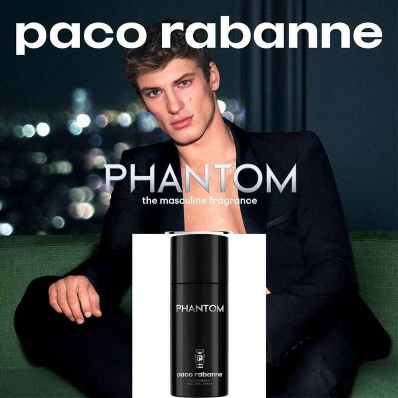 Desodorante Spray Phantom Rabanne Masculino 150mlDesodorante Spray Phantom Paco Rabanne Masculino Refresca instantaneamente a pele e a protege durante todo o dia.O Desodorante Paco Rabanne Phantom combina o frescor energizante do limão e a sensualidade da cremosa lavanda, despertando os sentidos e perfumando a pele de forma duradoura com as notas viciantes de Phantom. Um gesto energizante para a rotina diária.Conselho de AplicaçãoAplique o desodorante nas axilas limpas e secas e reaplique sempre que necessário, Recomenda-se uma distância mínima de 15 cm para aplicação. Nossos Experts EnsinamPara manter a fragrância o dia todo, use o perfume Phantom junto com o desodorante, pois harmonizam perfeitamente.Ação / ResultadoPele perfumada, livre de maus odores e com proteção intensa.