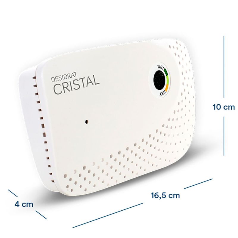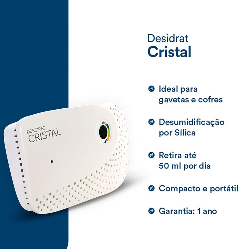 Desumidificador Thermomatic Desidrat Cristal - CRISTAL_BIVVocê precisa de um desumidificador compacto e eficiente para gavetas, armários, cofres, sapateiras e pequenas caixas? O Desidrat Cristal é a solução perfeita para você. Especialmente desenvolvido para essas aplicações, esse desumidificador retém a umidade em um compartimento de sílica que indica quando está saturado, podendo ser renovado facilmente após o uso. Além disso, é uma opção econômica, pois sua vida útil equivale a 120 potes tradicionais de sílica.Características:- Função: Desumidificar- Distância Alcançada: 1 metro cúbico- Tipo de Filtro: Sílica- Certificado pelo INMETROEspecificações Técnicas:- Modelo: CRISTAL_BIV- Potência: 20 W- Voltagem: Bivolt- Cor: Branco- EAN: 7898949633969- Garantia: 12 mesesDimensões e Peso:- Dimensões do produto sem embalagem (AxLxP): 45x165x100 mm- Dimensões do produto com embalagem (AxLxP): 50x190x110 mm- Peso do produto sem embalagem: 0,4 kg- Peso do produto com embalagem: 0,5 kgItens Inclusos:- 01 Desumidificar Cristal Branco