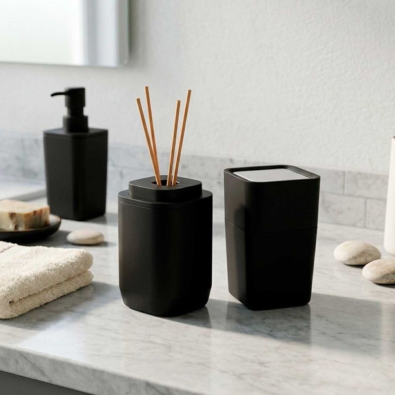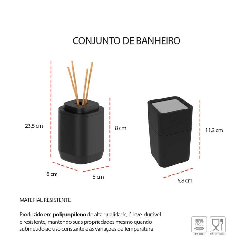 O kit difusor de ambiente com varetas e porta algodao é elegante e funcional, ideal para organizar e decorar banheiro ou lavabo. O difusor ajuda a perfumar o ambiente de forma suave e continua, enquanto o porta algodao é pratico para armazenar algodao e pequenos itens de higiene, mantendo a bancada organizada. Com design moderno e materiais resistentes, é uma combinação que une organização, praticidade e um toque decorativo ao ambiente. Contem: 1 Difusor de Ambiente com varetas Medidas: 23,5 x 8 x 8 cm Material: Poliestireno e bambu 1 Porta Algodao Medidas: 11,3 x 6,8 cm Material: Polipropileno