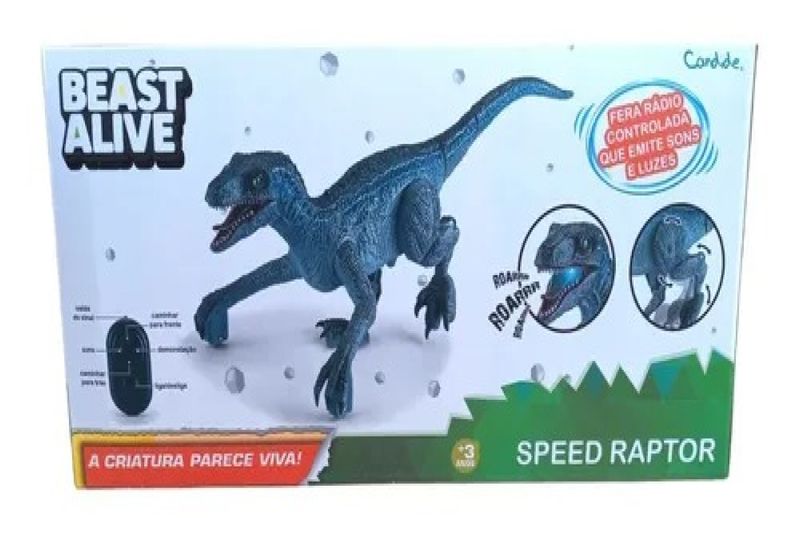 Dinossauro Beast Alive Controle Remoto Spped Raptor - Movimento Realistas. Som e Luzes - Candide Com o Dinossauro Speed Raptor Beast Alive com Controle Remoto, as suas brincadeiras irão ficar incríveis e divertidas!Ele tem diversos pontos de articulação, movimentos realistas e um andar assustador, como um dinossauro de verdade,luzes, tudo controlado por controle remoto de 3 funções infravermelho.É melhor se preparar para brincar com o seu Speed Raptor Beast Alive Idade acima de 3 anos Contem 1 dinossauro 1 controle remoto Tamanho da embalagem 38 x 18 x 18 cm Utiliza 6 pilhas AAA Fabricante Candide