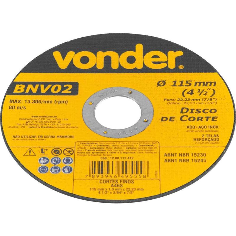 Disco de Corte 115 mm x 1 mm x 22,23 mm, BNV 02, Vonder OstenVonder - Conteúdo da embalagem: 1 Disco de corte. Aplicação: Indicado para serralheiros e demais profissionais em geral. Ideal para cortar barras, tubos, chapas metálicas, aço carbono e aço inox. Não utilizar em serra mármore. Destaques: Proporciona cortes rápidos e menor geração de calor e rebarbas. Referência: 1208112412 Garantia - E (CDC): Garantia legal: 90 dias Espessura: 1,0 mm (+/-3/64") Diâmetro do furo: 22,23 mm (7/8") Grão: G 60 Número de telas do disco: 2 Modelo: BNV 02 Tipo de disco: Tipo 41 Segue norma(s): ABNT NBR 15230 e ABNT NBR 16245 Diâmetro do disco de corte: 115 mm Rotação máxima do disco - rpm: 13.300/min Destaques Comercial: Proporciona cortes rápidos e menor geração de calor e rebarbas. Aplicação Comercial: Indicado para serralheiros e profissionais. Corta barras, tubos, chapas metálicas, aço carbono e inox. Não usar em serra mármore. Características Gerais do Produto: Garantia: • 3 Meses