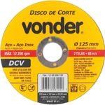 Disco De Corte 125 Mm X 1,2 Mm X 22,23 Mm, Dcv, Vonder OstenvonderDisco de Corte 125 mm x 1,2 mm x 22,23 mm, Dcv, Vonder OstenVonder -Conteúdo da embalagem: 1 Disco de corte.Aplicação: Indicado para cortar aços e suas ligas, inclusive aço inox. Ideal para operações de corte que necessitam excelente acabamento (corte fino). Para manutenções e reparos leves. Não utilizar em serra mármore.Destaques: Proporciona cortes rápidos e menor geração de calor e rebarbas.Referência: 1240500120Garantia - E (CDC): Garantia legal: 90 diasEspessura: 1,2 mm (+/-3/64)Diâmetro do furo: 22,23 mm (7/8)Modelo: DCVSegue norma(s): ABNT NBR 15230 e ABNT NBR 16245Grão: G 46Diâmetro do disco de corte: 125 mmNúmero de telas do disco: 2Tipo de disco: Tipo 41Rotação máxima do disco - rpm: 12.200/mim/minDestaques Comercial: Proporciona cortes rápidos e menor geração de calor e rebarbas.Aplicação Comercial: Indicado para corte de aços e ligas, incluindo inox, garantindo acabamento fino em manutenções leves. Não usar em serra mármore.Características Gerais do Produto:Garantia: - 3 Meses