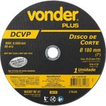 Disco de Corte 180 mm x 1,6 mm x 22,23 mm Dcvp, Vonder Plus - Conteúdo da embalagem: 1 Disco de corte. Aplicação: Indicado para cortar aços e suas ligas, inclusive aço inox. Ideal para operações de corte que necessitam excelente acabamento (corte fino). Com estrutura reforçada, é ideal para uso industrial. Não utilizar em serra mármore. Destaques: Proporciona cortes rápidos e menor geração de calor e rebarbas. Garantia - E (CDC): Garantia legal: 90 dias Referência: 1240016700 Espessura: 1,6 mm (+/-1/16") Diâmetro do furo: 22,23 mm (7/8") Grão: Grão 36 Número de telas do disco: 2 Segue norma(s): ABNT NBR 15230 e ABNT NBR 16245 Modelo: DCVP Diâmetro do disco de corte: 180 mm Tipo de disco: Tipo 41 Rotação máxima do disco - rpm: 8.500/min Destaques Comercial: Proporciona cortes rápidos e menor geração de calor e rebarbas. Aplicação Comercial: Disco para corte de aços e ligas, inclusive inox. Garante corte fino e bom acabamento em uso industrial; não utilizar em serra mármore. Características Gerais do Produto: Garantia: • 3 Meses