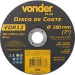 Disco De Corte 180 Mm X 3 Mm X 22,23 Mm Vdr12, Vonder Plus OstenvonderDisco de Corte 180 mm x 3 mm x 22,23 mm Vdr12, Vonder Plus OstenVonder -Conteúdo da embalagem: 1 Disco de corte.Aplicação: Indicado para cortes de aços e materiais ferrosos (barras, tubos e chapas) e aço inox. Com estrutura reforçada, é ideal para uso industrial. Não utilizar em serra mármore.Destaques: Possui excelente performance em trabalhos contínuos.Referência: 1207718780Garantia - E (CDC): Garantia legal: 90 diasEspessura: 3,0 mm (+/-1/8)Diâmetro do furo: 22,23 mm (7/8)Grão: G 30Número de telas do disco: 2Modelo: VDR 12Tipo de disco: Tipo 41Segue norma(s): ABNT NBR 15230 e ABNT NBR 16245Diâmetro do disco de corte: 180 mmRotação máxima do disco - rpm: 8.500/minDestaques Comercial: Possui excelente performance em trabalhos contínuos.Aplicação Comercial: Corta aços, materiais ferrosos e inox; estrutura reforçada para uso industrial. Não usar em serra mármore.Características Gerais do Produto:Garantia: - 3 Meses