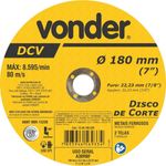 Disco de Corte 180 mm x 3,2 mm x 22,23 mm Dcv, Vonder OstenVonder - Conteúdo da embalagem: 1 Disco de corte. Aplicação: Indicado para serralheiros e demais profissionais em geral. Ideal para cortar aços e materiais ferrosos (barras, tubos e chapas), manutenções e reparos leves. Não utilizar em serra mármore. Destaques: Possui excelente performance em trabalhos intermitentes. Referência: 1240180320 Garantia - E (CDC): Garantia legal: 90 dias Espessura: 3,2 mm (+/-1/8") Diâmetro do furo: 22,23 mm (7/8") Grão: G 30 Número de telas do disco: 2 Modelo: DCV Tipo de disco: Tipo 41 Segue norma(s): ABNT NBR 15230 e ABNT NBR 16245 Diâmetro do disco de corte: 180 mm Rotação máxima do disco - rpm: 8.595/min Destaques Comercial: Possui excelente performance em trabalhos intermitentes. Aplicação Comercial: Para serralheiros e profissionais em geral. Ideal para cortes em aços e ferrosos e reparos leves. Não usar em serra mármore. Características Gerais do Produto: Garantia: • 3 Meses