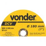 Disco De Corte 180,0x3,2x22,23 Dcv VonderConteúdo da Embalagem:1 Disco de corteDescrição:Disco de corte 180 mm x 3,2 mm x 22,23 mm DCV VONDERAplicações e dicas de uso:Indicado para serralheiros e demais profissionais em geral. Ideal para cortar aços e materiais ferrosos (barras, tubos e chapas), manutenções e reparos leves. Não utilizar em serra mármore.Destaques e diferenciais:Possui excelente performance em trabalhos intermitentesCaracterísticas Técnicas:Diâmetro do disco de corte: 180 mm - 7Espessura do disco de corte: 3,2 mm - 1/8Diâmetro do furo do disco de corte: 22,23 mm - 7/8Número de telas do disco: 2Grão: G 30Rotação máxima do disco (rpm): 8.595 rpmNorma de referência: ABNT NBR 15230 e ABNT NBR 16245Garantia legal: 90 dias Produto: Disco | Marca: Vonder