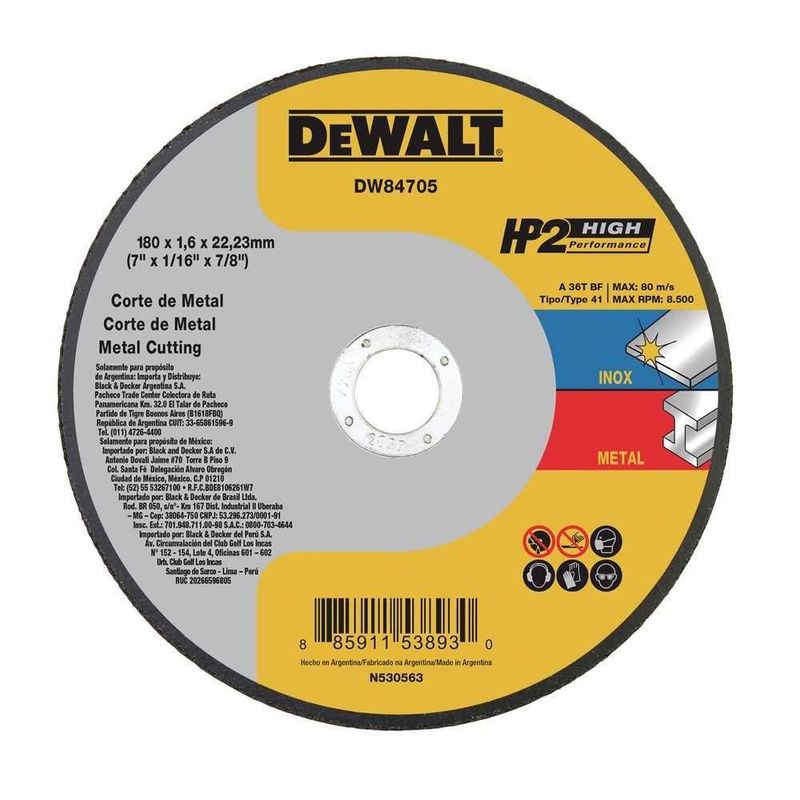 Disco De Corte 180x1.6x22mm Aço/inox Hp2 Dewalt Dw84705 - 10 UnidadesDisco de Corte 180X1.6X22mm Aço/Inox HP2 Dewalt DW84705 - 10 Unidades - KIT COM 10 UNIDADESCaracterísticas Gerais do Produto: - Modelo: DW84705 - Marca: Dewalt - Material: Grão de óxido de alumínio de alto desempenho - Especificações: Alta concentração de grão para uma ação de corte rápida.; Sem ferro, enxofre e cloro para um corte livre de contaminantes.; - Dimensões: 180 X 1.6 X 22mm - Ideal Para: Corte de inox e metal. - Garantia direto com o Fabricante: 3 Meses Contra Defeitos de Fabricação Garantia: - 03 meses de garantia direto com o fabricante