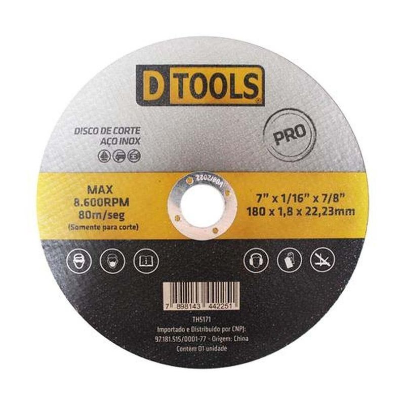 Disco De Corte 7'' X 1,8mm Para Aço/inox - DtoolsDisco de Corte 7'' X 1,8mm para Aço/Inox - DTOOLS -DISCO DE CORTE AÇO/INOX 7'' X 1,8MM - DTOOLSDESCRIÇÃO PERSUASIVA:Chegou o momento de elevar o nível da sua manutenção industrial com o Disco de Corte Aço/Inox 7'' X 1,8mm da DTOOLS. Com a qualidade da linha PRO, este disco oferece um corte preciso e eficiente, sendo ideal para trabalhos em aço e aço inoxidável. Seja na indústria ou em projetos de manutenção em geral, este disco é a escolha perfeita para quem busca durabilidade e performance superior. Invista em qualidade e precisão com o Disco de Corte DTOOLS!RESUMO EM DESTAQUES:- Disco de corte de alta qualidade- Tamanho de 7 polegadas x 1,8mm- Indicado para corte em aço e aço inoxidável- Ideal para manutenção industrial em geral- Linha PRO para resultados profissionaisINFORMAÇÕES TÉCNICAS:- Material: Aço/Inox- Tamanho: 7 polegadas x 1,8mm- Indicação: Corte em Aço e Aço Inoxidável- Quantidade: 1 unidade- Marca: DTOOLS- Linha: PROGARANTIA:Garanta já o seu Disco de Corte Aço/Inox 7'' X 1,8mm da DTOOLS Universo do Lar e tenha a certeza de estar adquirindo um produto de alta qualidade e durabilidade. Sua satisfação é nossa prioridade! --------Descrição Original enviada pelo Fornecedor:DISCO DE CORTE AÇO/INOX 7'' X 1,8MM - DTOOLSLinha PROCorte Preciso2 em 1 ¿ Corte em Aço e Aço InoxidávelPara manutenção industrial em geralQuantidade da Embalagem: 10 unidadesVenda: unitárioCaracterísticas Gerais do Produto:Garantia: - 3 meses