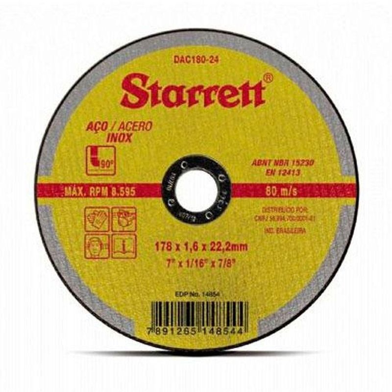 Disco De Corte Aço 7 X 1,6mm Starrett Para Aço Carbono E Inox - 178mm Diâmetro - 22,22mm FuroDisco de Corte Aço 7 x 1,6mm Starrett para Aço Carbono e Inox - 178mm Diâmetro - 22,22mm Furo -DISCO DE CORTE AÇO 7 X 1,6MM - STARRETTCom o Disco de Corte Aço 7 X 1,6mm da Starrett, você terá em mãos a ferramenta ideal para cortar materiais em aço carbono e aço inox, como tubos, chapas, perfis, barras e outros materiais ferrosos. Seja para uso profissional ou doméstico, este disco proporciona alto desempenho e produtividade, garantindo resultados precisos e seguros em suas atividades.* Produto reforçado com 2 telas para maior durabilidade e segurança* Diâmetro Externo: 178 mm* Espessura: 1,6 mm* Diâmetro do Furo: 22,22 mm* Rotação RPM: 8.595* Rotação m/seg: 80Com o Disco de Corte Aço 7 X 1,6mm da Starrett, você terá a garantia de um produto de qualidade, resistente e durável, que irá facilitar suas tarefas diárias com eficiência e precisão. Invista em qualidade, invista em Starrett Universo do Lar. --------Descrição Original enviada pelo Fornecedor:DISCO DE CORTE AÇO 7 X 1,6MM - STARRETTAplicação:Materiais em aço carbono e aço inox, tais como tubos, chapas, perfis, barras e outros materiais ferrosos.Características:Produto reforçado com 2 telas, proporcionando alto desempenho e produtividade aliado à segurança.Informações:Nº catálogo: DAC180-24.Diâmetro Externo: 178 mmEspessura: 1,6 mm.Diâmetro do Furo: 22,22 mm.Rotação RPM: 8.595.Rotação m/seg: 80Características Gerais do Produto:Garantia: - 3 meses