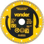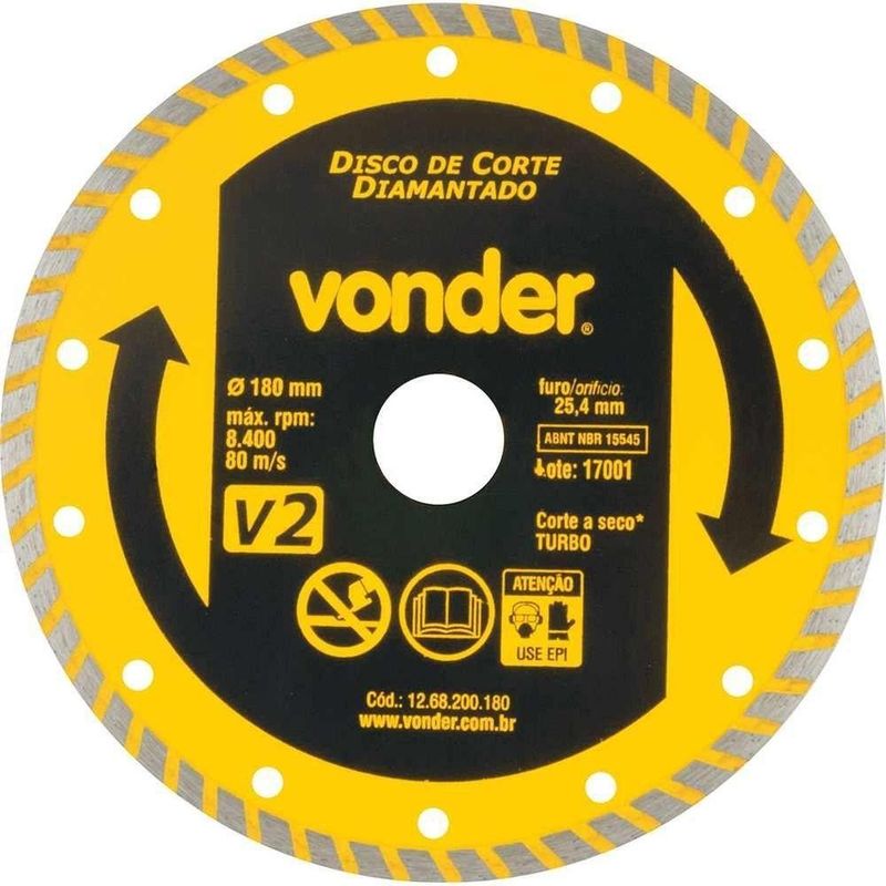 Disco De Corte Diamantado, 180 Mm, Turbo, V2, Vonder OstenvonderDisco de Corte Diamantado, 180 mm, Turbo, V2, Vonder OstenVonder -Conteúdo da embalagem: 1 Disco de corte diamantado.Aplicação: Indicado para cortar mármore, granito, concreto, tijolo, telhas, alvenaria e pedras. Os discos de corte a seco, quando refrigerados proporcionam um melhor rendimento.Destaques: Maior profundidade de corte, acompanha bucha de redução de 25,4 mm para 22,2 mm.Referência: 1268200180Garantia - E (CDC): Garantia legal: 90 diasModelo: V2Perfil do corte: TurboTipo de corte do disco de corte diamantado: A secoDiâmetro externo do disco de corte diamantado: 180 mmDiâmetro do furo do disco de corte diamantado: 25,4 mmAltura do segmento diamantado: 7 mmEspessura do segmento diamantado: 2,4 mmMassa aproximada (peso): 0,390 kgSegue norma: ABNT NBR 15545Rotação máxima - rpm: 8.400/minDestaques Comercial: Maior profundidade de corte, com bucha de redução de 25,4 mm para 22,2 mm.Aplicação Comercial: Corte de mármore, granito, concreto, tijolo, telhas e pedras; uso a seco ou com refrigeração para melhor rendimento.Características Gerais do Produto:Garantia: - 3 Meses