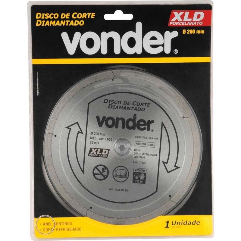 Disco De Corte Diamantado, 200 Mm, Contínuo, Para Porcelanato, Xld Vonder OstenvonderDisco de Corte Diamantado, 200 mm, Contínuo, Para Porcelanato, XLD Vonder OstenVonder -Conteúdo da embalagem: 1 Disco diamantado.Aplicação: Especialmente indicado para cortar porcelanatos e cerâmicas duras. Utilizado em cortadores de cerâmicas e porcelanatos compatíveis com o diâmetro e furo do disco. Velocidade periférica máxima: 80 m/s.Destaques: Disco com rendimento superior no corte de porcelanatos e cerâmicas duras, proporcionando também ótimo acabamento e maior profundidade de corte. Acompanha bucha de redução de 25,4 mm para 22,2 mm.Garantia - E (CDC): Garantia legal: 90 diasReferência: 1268800200Modelo: XLDPerfil do corte: ContínuoTipo de corte do disco de corte diamantado: RefrigeradoDiâmetro externo do disco de corte diamantado: 200 mmDiâmetro do furo do disco de corte diamantado: 25,4 mmAltura do segmento diamantado: 7 mmEspessura do segmento diamantado: 1,8 mmMassa aproximada (peso): 0.43 kgSegue norma: ABNT NBR 15545Rotação máxima - rpm: 7600/minDestaques Comercial: Disco de alto rendimento para corte e ótimo acabamento em porcelanatos e cerâmicas duras. Inclui bucha 25,4?22,2 mm.Aplicação Comercial: Indicado para cortar porcelanatos e cerâmicas duras em cortadores compatíveis. Velocidade máxima 80 m/s.Características Gerais do Produto:Garantia: - 3 Meses