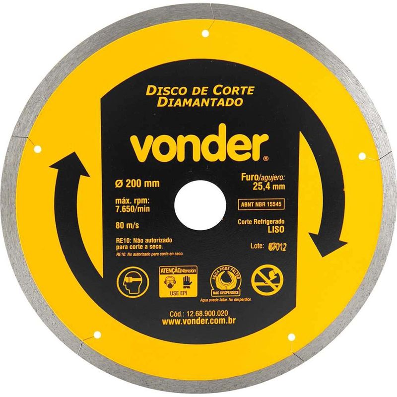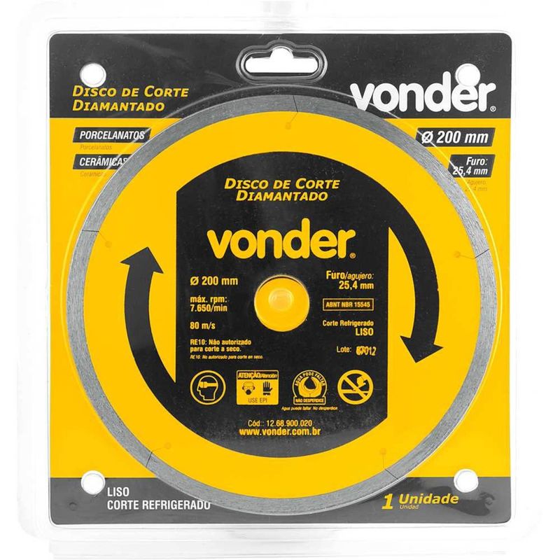 Disco de Corte Diamantado, 200 mm, Liso, Vonder - Conteúdo da embalagem: 1 Disco de corte diamantado. Aplicação: Especialmente indicado para cortar porcelanatos e cerâmicas duras. Utilizado em cortadores de cerâmicas e porcelanatos compatÃveis com o diâmetro e furo do disco. Velocidade periférica máxima: 80 m/s. Destaques: Proporciona alta performance para cortar porcelanatos e cerâmicas duras. Referência: 1268900020 Garantia - E (CDC): Garantia legal: 90 dias Perfil do corte: Liso Tipo de corte do disco de corte diamantado: Refrigerado Diâmetro externo do disco de corte diamantado: 200 mm Diâmetro do furo do disco de corte diamantado: 25,4 mm Altura do segmento diamantado: 10,3 mm Espessura do segmento diamantado: 1,6 mm Massa aproximada (peso): 0,38 kg Segue norma: ABNT NBR 15545 Rotação máxima - rpm: 7.650/min Destaques Comercial: Proporciona alta performance para cortar porcelanatos e cerâmicas duras. Aplicação Comercial: Indicado para cortar porcelanatos e cerâmicas duras, usado em cortadores compatÃveis; velocidade máx. 80 m/s. Características Gerais do Produto: Garantia: • 3 Meses