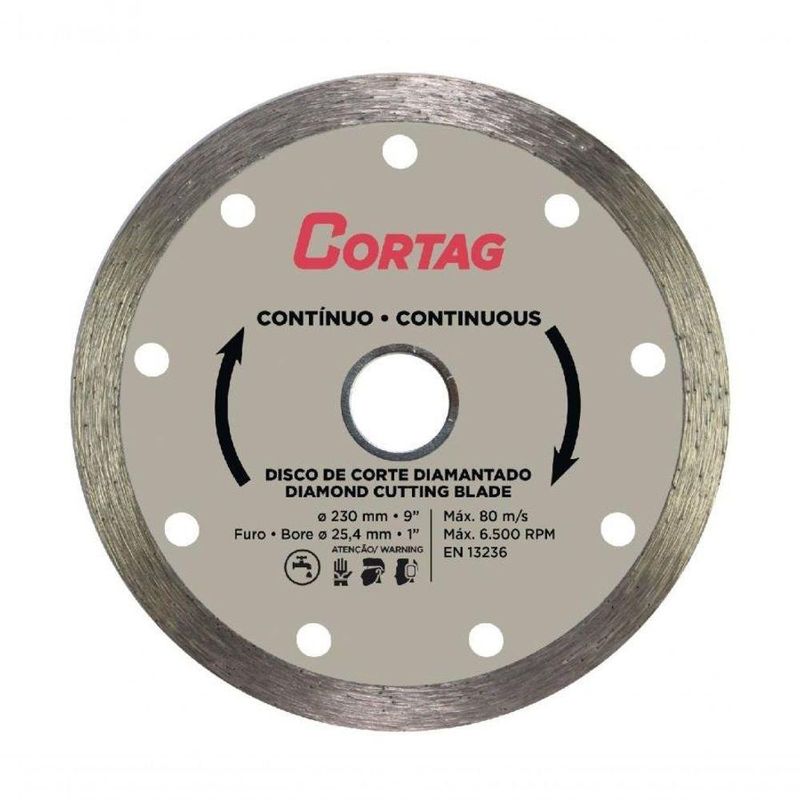 Disco De Corte Diamantado Contínuo 230mm - CortagDisco Diamantado Contínuo.Aplicável em Cerâmica, Azulejo, Telha e Tijolo. Especificações Diâmetro do furo 25,4 mm Rotação 6500 rpm Tipo Contínuo Diâmetro do disco 230 mm Tipo de corte Refrigerado Altura cm Largura 23 cm Comnto 23 cm Peso Bruto kg Consulte o Manual Download