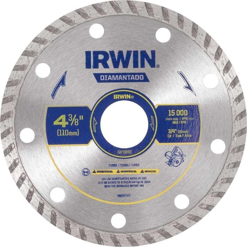 Disco De Corte Diamantado, Turbo, 110 Mm, Furo De 20 Mm, Iw13893 Irwin OstenvonderDisco de Corte Diamantado, Turbo, 110 mm, Furo de 20 mm, Iw13893 Irwin OstenVonder -Conteúdo da embalagem: 1 Disco de corte diamantado.Aplicação: Indicado para cortes em concretos, rebocos, refratários, tijolos e basalto.Destaques:Garantia - E (CDC): Garantia legal: 90 diasReferência: IW13893Modelo: IW13893Perfil do corte: TurboTipo de corte do disco de corte diamantado: Seco ou refrigeradoDiâmetro externo do disco de corte diamantado: 110 mmDiâmetro do furo do disco de corte diamantado: 20 mmAltura do segmento diamantado: 6 mmEspessura do segmento diamantado: 2,0 mmMassa aproximada (peso): 0,5 kgRotação máxima - rpm: 15.000/minAplicação Comercial: Indicado para cortes em concretos, rebocos, refratários, tijolos e basalto.Características Gerais do Produto:Garantia: - 3 Meses