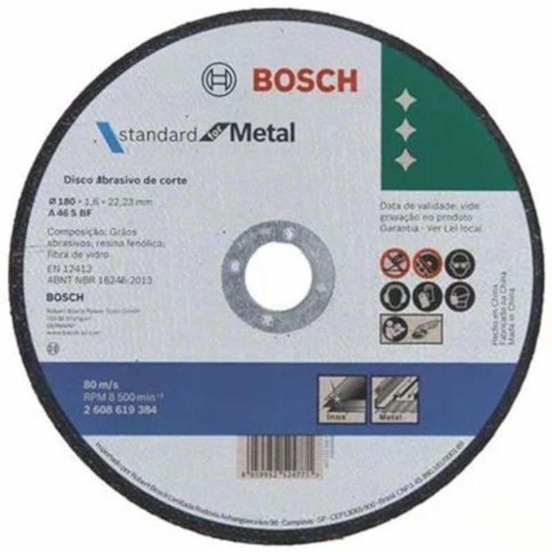 Disco de Corte Metal E Inox Std 180x1,6mm - 2608619384-000 - Bosch Disco de Corte Metal E Inox Std 180x16... - 2608619384-000 - BoschDisco de Corte Metal e Inox STD 180x1,6mm - 2608619384-000 - BOSCHDescrição:O seu disco de óxido de alumínio foi elaborado para utilização geral com metal. É compatível com esmerilhadeiras angulares.Uso:Utilize este disco para cortar metal. Os discos de corte da Bosch cumprem os requisitos máximos de segurança, como a EN 12413.EN 12413ABNT NBR 16245: 2013Medidas:- Diâmetro: 180 mm- Diâmetro da cavidade: 22,23 mm- Espessura: 1,6 mm* Imagem meramente ilustrativameli_shipping_mode - me1