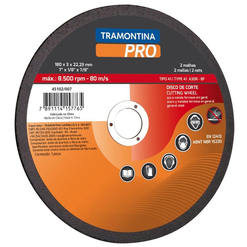 Disco de Corte para Aços e Metais Ferrosos em Geral 4.1/2" Tramontina PRO Utilizado no corte de aços e metais ferrosos em geral, a linha de discos de corte da Tramontina PRO é produzida e testada para garantir segurança e resistência. A ferramenta certa para você que trabalha em manutenções industriais. Disco produzido em óxido de alumínio.Corpo reforçado com 2 malhas de fibra de vidro.Anel interno de aço especial.Velocidade máxima de trabalho 80m/s - 13300 rpm.Modelo tipo 41 - A46T-BF.EN12413.ABNT NBR 15230.Utilizado juntamente com esmerilhadeiras nos trabalhos de corte em aços e metais ferrosos em geral.Proporciona um excelente rendimento nas operações de corte.Todas as ferramentas são produzidas e testadas conforme normas específicas.