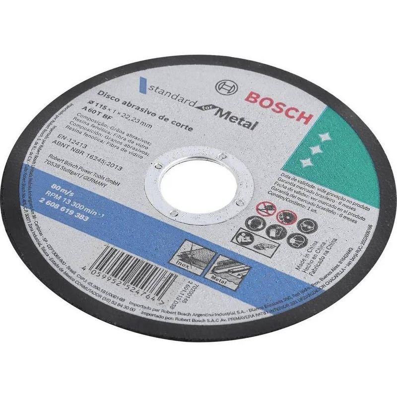 Disco De Corte Para Esmerilhadeira Inox 4.1/2 7/8 Standard Reto Profissional - BoschO Disco de Corte Standard Reto para Inox 4.1/2”-7/8” Bosch foi projetado para entregar cortes rápidos, precisos e com excelente acabamento. Com diâmetro de 115 mm e espessura de 1 mm, oferece agilidade e controle, garantindo produtividade em tarefas profissionais e industriais. Produzido com óxido de alumínio de grão 60, proporciona equilíbrio entre velocidade e durabilidade, suportando rotações de até 13.300 RPM. Seu centro reto aumenta a estabilidade durante o uso, enquanto sua construção reforçada assegura desempenho contínuo mesmo em operações intensas. Ideal para cortes em aço inoxidável, metais ferrosos, não ferrosos e ferro fundido, o disco segue normas internacionais e apresenta geometria projetada para cortes mais seguros e consistentes.Por que escolher este disco:- Alta velocidade de corte para maior produtividade- Desempenho superior em aço inoxidável com cortes limpos- Construção robusta que garante longa vida útilAumente sua eficiência nos trabalhos metálicos. Garanta o seu agora e alcance resultados profissionaisEspecificações:Material: Óxido de AlumínioDiâmetro do Disco: 115 mm (4.1/2”)Espessura: 1 mmDiâmetro do Furo: 22,23 mm (7/8”)Tamanho do Grão: 60Centro: RetoMáxima Rotação: 13.300 RPMCompatibilidade: Esmerilhadeiras ManuaisPeso Aproximado: 35 gDimensões: 11 x 11 x 1Conteúdo da Embalagem:1 Disco de CorteGarantia:90 diasImportante:- Imagens meramente ilustrativas. Os objetos decorativos e demais itens que aparecem nas fotos não acompanham o produto.- Ao receber a mercadoria verifique a condição da embalagem, caso apresente violação ou esteja danificada não assine o comprovante de entrega.- Garantia condicionada ao uso correto. O uso indevido do produto, em desacordo com o manual ou com as instruções do fabricante, poderá anular a garantia.