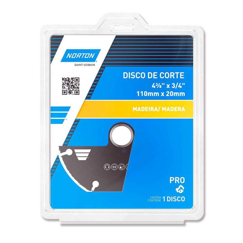 Disco de Corte Para Madeira 110 mm 69957315170 Norton OstenVonder - Conteúdo da embalagem: 1 Disco de corte para madeira. Aplicação: Indicado para uso em serras mármore. Corta rapidamente, com precisão e suavidade, sem trancos durante a operação. Permite o corte de madeiras com resÃduos de concreto, grampos e/ou pequenos pregos (até 3,0 mm de diâmetro). Corta, além de madeira, gesso, fibra de vidro e plástico. Destaques: Possui borda em carboneto de tungstênio. Oferece maior segurança que os discos dentados, pois não trava durante a operação. Acompanha bucha de redução para eixos de 16 mm. Referência: 69957315170 Garantia - E (CDC): Garantia legal: 90 dias Massa aproximada (peso): 0,9 kg Diâmetro externo: 110 mm Diâmetro do furo do disco: 20,0 mm Rotação máxima - rpm: 13.800/min Destaques Comercial: Borda em carboneto de tungstênio, mais segura que discos dentados. Acompanha bucha para eixo de 16 mm. Aplicação Comercial: Uso em serras mármore. Corta rápido e preciso madeiras com pregos, concreto, gesso, fibra de vidro e plástico. Características Gerais do Produto: Garantia: • 3 Meses