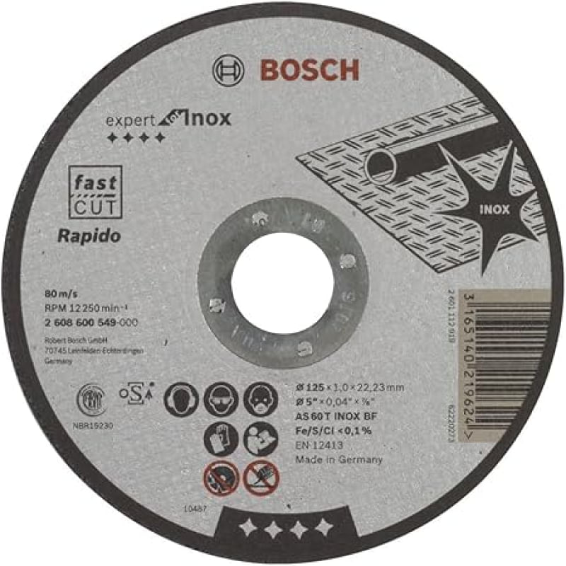 - O Disco de corte Bosch Expert for Inox, efetua cortes em alta velocidade além de proporcionar um grande rendimento, com cada disco sendo capaz de executar diversos cortes em aço inoxidável até o fim de sua vida útil;- São produzidos com grãos abrasivos de óxido de alumínio de alta qualidade e alta dureza, com aditivos que reduzem o calor gerado durante o corte, além de telas de fibra de vidro feitas com precisão e simetria que trazem grande estabilidade para os discos;- Dessa forma, os discos são capazes de efetuar cortes com menos rebarbas e possuem longa durabilidade. Em sua formulação não possuem ferro, cloro e enxofre, o que evita a contaminação dos materiais a serem trabalhados;- São fabricados sob alto padrão de qualidade em conformidade com as normas internacionais (EN 12413) e possuem certificações de qualidade como ABNT (Brasil) e OSA (Europa) trazendo máxima segurança durante sua aplicação;- São indicados para corte de metais ferrosos e não ferrosos, aço inoxidável e ferro fundido e utilização em esmerilhadeiras manuais.Especificação Técnica- Acabamento / Composição: Óxido de Alumínio, Resina Fenólica, Fibra de Vidro, Aço;- Uso material indicado: Metais ferrosos e não ferrosos, aço inoxidável;- Diâmetro do item: 125 mm (5");- Espessura: 1 mm (0,040");- Diâmetro do furo: 22,23 mm (7/8");- Tipo: Corte;- Tipo de grão: Óxido de Alumínio;- Tamanho do grão: 60;- Fórmula: AS 60 T INOX BF;- Centro: Reto;- RPM máximo: 12.250;- Código EAN: 3165140219624;- Referência do Fornecedor: 2608600549;- Marca: BOSCH.SKU: 00742568