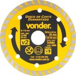 Disco De Corte V2 110 X 20mm Para Construção - VonderPrincipais Características:- Indicado para cortar mármore, granito, concreto, tijolo, telhas, alvenaria e pedras;- Os discos de corte a seco, quando refrigerados proporcionam um melhor rendimento;- Maior velocidade de corte, aumentando o rendimento no trabalho;- Acompanha bucha de redução de 20 para 16 mm. Especificações Diâmetro do furo 20mm Diâmetro do disco 110mm Peso 110g Perfil do Corte Segmentado Tipo de corte Seco Altura 15.75 cm Largura 15.75 cm Comprimento 1.05 cm Peso Bruto 0.116 kg