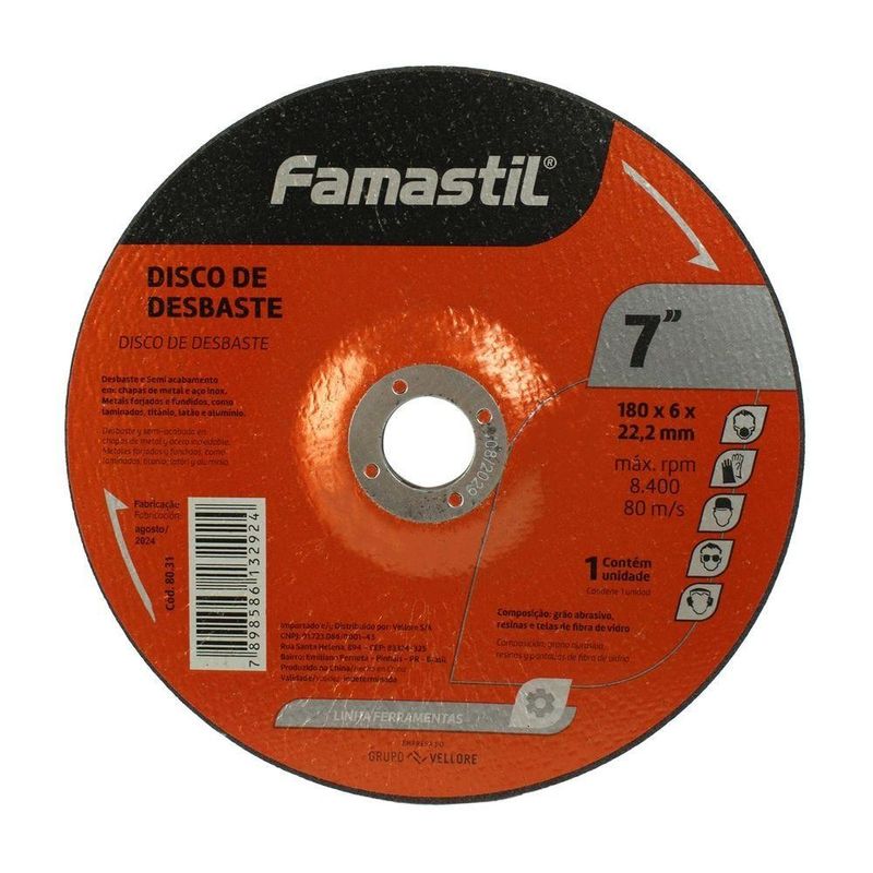 Disco De Desbaste Famastil 7pol 180x22cmDisco de Desbaste 7 (180x6x22 mm) – FamastilO Disco de Desbaste Famastil 7 (180x6x22 mm) é a ferramenta ideal para operações de desbaste em aço carbono, estruturas metálicas, chapas, soldas e materiais ferrosos em geral. Fabricado com abrasivo de alto desempenho e reforçado com malha de fibra de vidro, proporciona remoção rápida de material com segurança e estabilidade, mesmo em aplicações intensas.Sua espessura de 6 mm permite o uso contínuo em superfícies mais exigentes, mantendo a resistência à abrasão e o controle durante o trabalho. Compatível com esmerilhadeiras angulares de grande porte, é indicado para uso profissional na construção civil, serralheria, metalurgia e manutenção industrial.Diferenciais no mercado:- Desempenho superior em remoção de material, com menor vibração e maior controle.- Alta durabilidade, mesmo em trabalhos pesados e prolongados.- Reforço interno com malhas de fibra de vidro, garantindo segurança em rotações elevadas.- Fabricado com abrasivos de qualidade premium, que evitam desgaste irregular e aumentam o rendimento.- Ideal para desbaste de soldas, rebarbas, bordas e superfícies metálicas.Ficha Técnica- Marca: Famastil- Tipo: Disco de Desbaste Reto- Aplicação: Aço carbono e metais ferrosos- Diâmetro externo: 7 (180 mm)- Espessura: 6 mm- Furo (eixo): 22,2 mm- Material abrasivo: Óxido de alumínio com resina reforçada- Velocidade máxima: 8.500 RPM- Indicação: Serralheria, caldeiraria, manutenção, construção civil- Tipo de uso: Profissional- Compatibilidade: Esmerilhadeiras angulares de 7- Embalagem: 1 unidadeSobre a MarcaA Famastil, marca do Grupo Vellore, é referência no mercado nacional em ferramentas manuais e acessórios de alto desempenho. Com décadas de atuação e reconhecimento entre profissionais exigentes, a marca alia tecnologia, segurança e durabilidade em todos os seus produtos. Sua linha de discos abrasivos é desenvolvida com rígido controle de qualidade, garantindo excelente performance para as demandas da construção civil, indústria e manutenção pesada.
