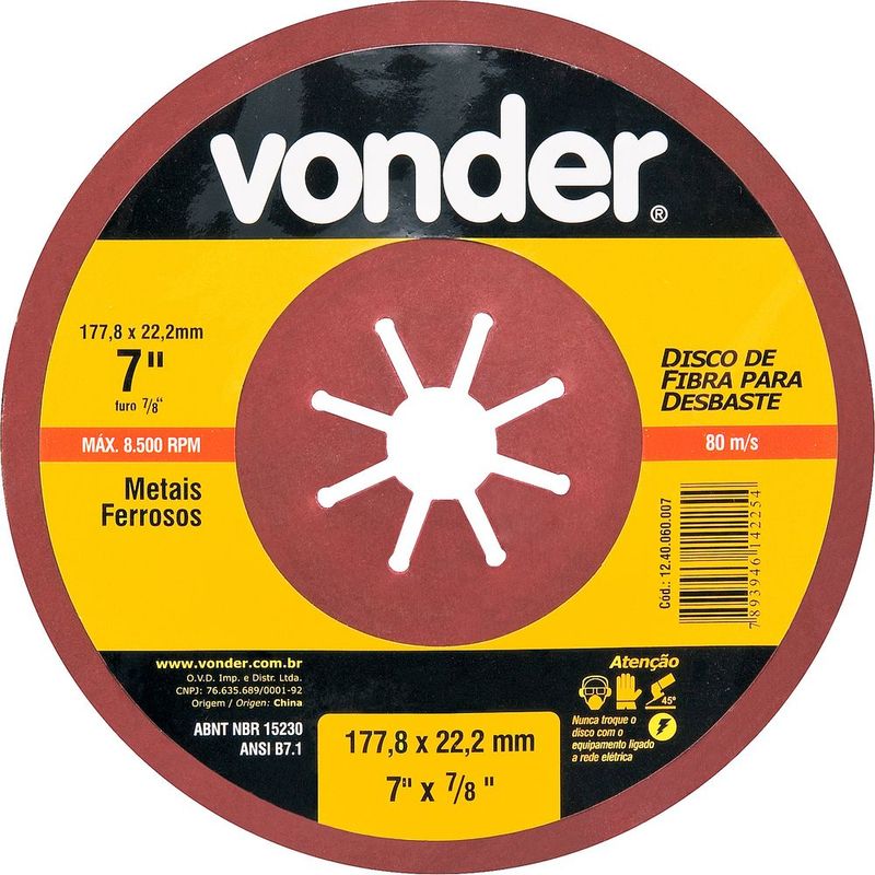 Marca: VonderConteúdo da Embalagem:1 Disco de fibra para desbasteDestaques e diferenciais:Devido as opções de grãos, realiza melhor acabamento se comparado aos discos de desbaste convencionaisAplicações e dicas de uso:Indicado para desbaste em metais ferrosos Características Técnicas:Diâmetro externo do disco de fibra para desbaste: 7" - 180 mm Diâmetro do furo do disco de fibra para desbaste: 7/8" - 22,22 mm Grão: G 40