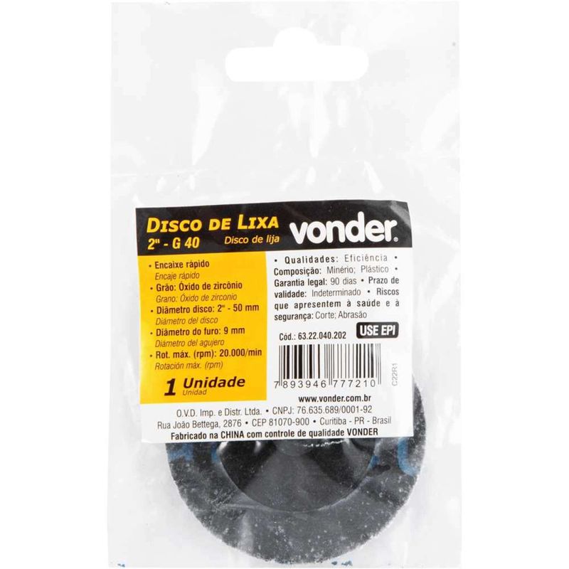 Disco de Lixa 2", Óxido de Zircônio Grão 40, Para Sistema de Encaixe Rápido, Vonder OstenVonder - Conteúdo da embalagem: 1 Disco. Aplicação: Utilizado com retifica angular pneumática para lixamentos em geral de aço, alumÃnio e aço inox, remoções de ferrugens. Funciona bem em superfÃcies ásperas, média vida útil, geralmente usados para lixar metais duros. Utilizado com o suporte com haste 2" VONDER (63.22.005.050), (não acompanha). Destaques: Possui sistema de substituição rápida de acessórios. Referência: 6322040202 Garantia - E (CDC): Garantia legal: 90 dias Massa aproximada (peso): 0,006 kg Diâmetro: 2" - 50 mm Grão: G 40 Cor: Azul Rotação máxima - rpm: 20.000/min Tipo de grão abrasivo: Ãxido de zircônio Destaques Comercial: Possui sistema de substituição rápida de acessórios. Aplicação Comercial: Usado em retÃfica pneumática para lixamento de aço, alumÃnio e inox, removendo ferrugem e rebarbas. CompatÃvel com suporte com haste 2" VONDER (63.22.005.050), não incluso. Características Gerais do Produto: Garantia: • 3 Meses