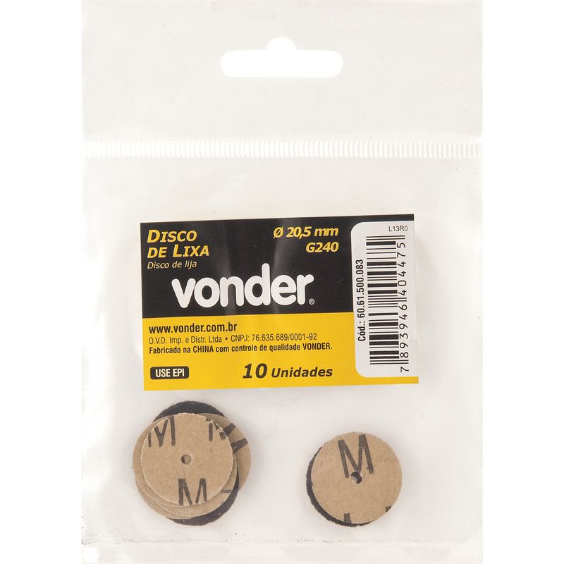 Conteúdo da embalagem1 Pacote com 10 discos de lixaAplicações e dicas de usoIndicado para acabamento e desbaste DETALHES TÉCNICOS Diâmetro do disco: 20,5 mm Diâmetro do furo do disco: 2,00 mm Tipo de costado: Base papel Tipo de grão abrasivo: Óxido de alumínio Grão: G 240