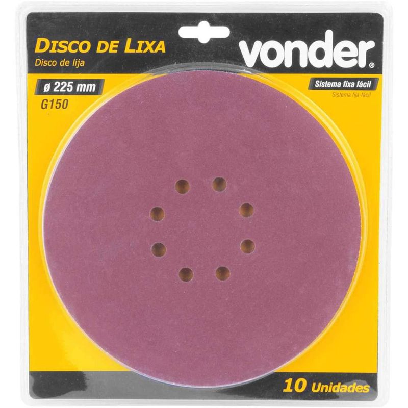Disco de Lixa com Costado em Pluma 225 mm, Grão 150, Para as Lixadeiras LPV 400b, LPV 600, LPV 925, LPV 950b e LPV 1000, Vonder OstenVonder - Conteúdo da embalagem: 1 Pacote com 10 discos de lixa. Aplicação: Ideal para lixar paredes de alvenaria, gesso e massa corrida. Indicado para as lixadeiras LPV 400B, LPV 600, LPV 925, LPV 950B e LPV 1000 VONDER e também outras marcas, desde que o diâmetro e a furação sejam compatÃveis. Destaques: Possui sistema fixa fácil e 8 furos para aspiração da poeira. Referência: 1258225150 Garantia - E (CDC): Garantia legal: 90 dias Massa aproximada (peso): 0,29 kg Diâmetro do disco de lixa: 225 mm Grão: G 150 Nº de furos: 8 furos Tipo de grão abrasivo: Ãxido de alumÃnio Destaques Comercial: Possui sistema fixa fácil e 8 furos para aspiração da poeira. Aplicação Comercial: Ideal para lixar paredes de alvenaria, gesso e massa corrida. CompatÃvel com lixadeiras Vonder LPV e outras marcas com diâmetro e furação compatÃveis. Características Gerais do Produto: Garantia: • 3 Meses