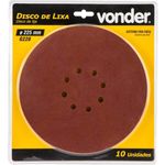 Disco de Lixa com Costado em Pluma 225 mm, Grão 220, Para as Lixadeiras LPV 400b, LPV 600, LPV 925, LPV 950b e LPV 1000, Vonder OstenVonder - Conteúdo da embalagem: 1 Pacote com 10 discos de lixa. Aplicação: Ideal para lixar paredes de alvenaria, gesso e massa corrida. Indicado para as lixadeiras LPV 400B, LPV 600, LPV 925, LPV 950B e LPV 1000 VONDER e também outras marcas, desde que o diâmetro e a furação sejam compatÃveis. Destaques: Possui sistema fixa fácil e 8 furos para aspiração da poeira. Referência: 1258225220 Garantia - E (CDC): Garantia legal: 90 dias Nº de furos: 8 furos Massa aproximada (peso): 0,166 kg Diâmetro do disco de lixa: 225 mm Grão: G 220 Tipo de grão abrasivo: Ãxido de alumÃnio Destaques Comercial: Possui sistema fixa fácil e 8 furos para aspiração da poeira. Aplicação Comercial: Indicada para lixar paredes de alvenaria, gesso e massa corrida, compatÃvel com lixadeiras VONDER e outras marcas que tenham mesmo diâmetro e furação. Características Gerais do Produto: Garantia: • 3 Meses