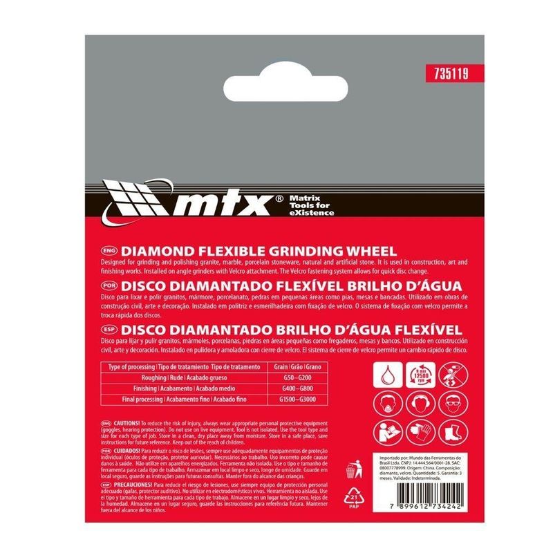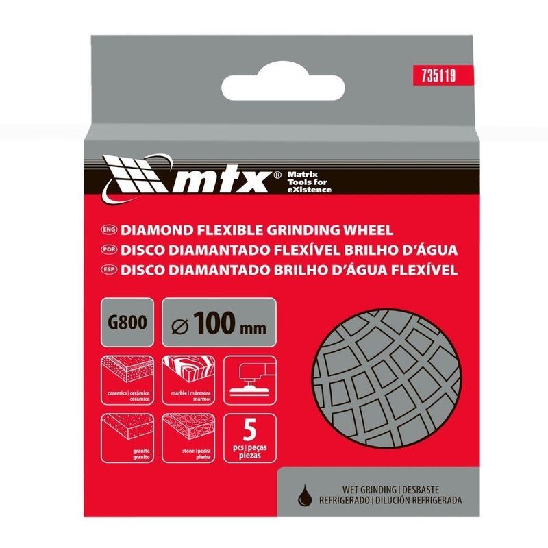 Disco De Lixa Diamantada Flexível 100mm 800 Graus 5pç MtxDisco de Lixa Diamantada Flexível 100mm 800 Graus 5Pç MTX para Acabamento ImpecávelObtenha um acabamento de qualidade profissional com o Disco de Lixa Flexível Diamantada MTX 735119.Ideal para lixamento úmido de granito, pedra, cerâmica e mármore, este disco de 100mm com granulometria P 800 garante suavidade excepcional em superfícies, perfeito para os estágios finais de acabamento.Sua composição com termoplástico verde claro revestido com diamante permite o uso em diversos materiais, incluindo cores e pretos, sem danificar a superfície. A flexibilidade do disco se adapta a relevos e contornos complexos, proporcionando um resultado uniforme e meticuloso.Projetado para uso com rebarbadoras, requer um prato de apoio específico para discos de lixa flexíveis de diamante, garantindo instalação rápida e segura. A alta durabilidade, proporcionada pelas partículas de diamante de alta concentração e ligação termoplástica resistente, assegura um desempenho consistente.Os sulcos na superfície evitam o entupimento por resíduos, mantendo a eficiência do lixamento.A fixação por fecho de contato permite trocas rápidas, otimizando o tempo de trabalho. A embalagem com 5 unidades oferece praticidade e economia para projetos de longa duração. Especificações Granulometria: P 800 Material do abrasivo: diamante Diâmetro: 100 mm Espessura: 5 mm Altura do segmento: 3 mm País de fabricação: China Itens Inclusos 5 Discos de Lixa Diamantada Flexível 100mm 800 Graus MTX Perguntas Frequentes (FAQ) Pergunta: Para quais materiais este disco é adequado?Resposta: Este disco é ideal para lixamento úmido de granito, pedra, cerâmica e mármore. Pergunta: Qual o tipo de fixação do disco?Resposta: O disco possui fixação por fecho de contato, permitindo uma troca rápida e fácil. Pergunta: Este disco pode ser usado em rebarbadoras?Resposta: Sim, este disco é projetado para uso com rebarbadoras, mas requer um prato de apoio específico para discos de lixa flexíveis de diamante. Pergunta: Qual a garantia do produto?Resposta: Garantia legal: 90 dias Produto: Disco | Tipo de Produto: Disco