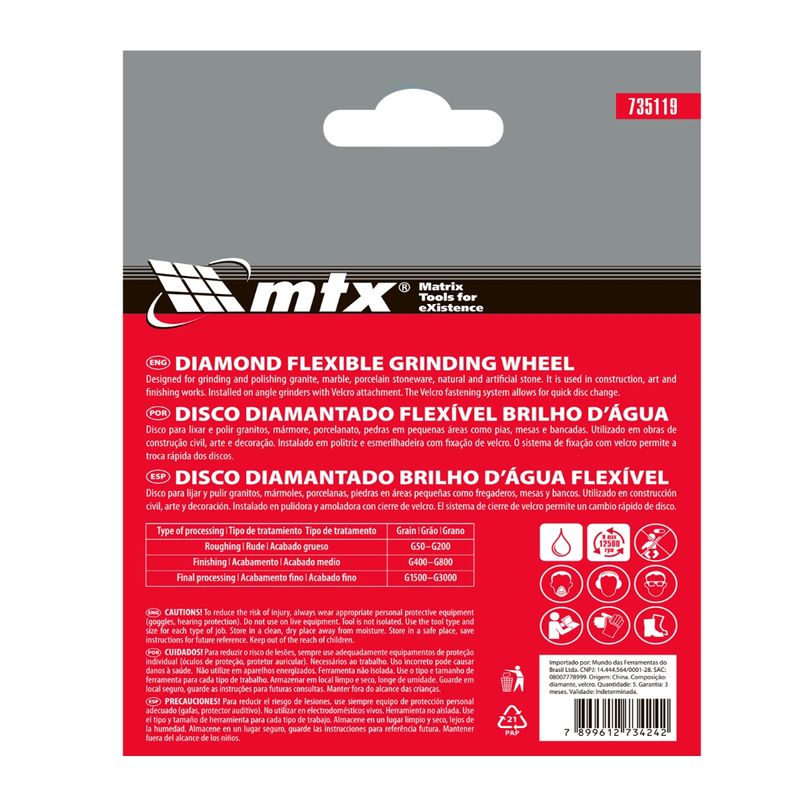 Disco de Lixa Diamantada Flexível 100mm 800 Graus 5Pç MTX para Acabamento Impecável Obtenha um acabamento de qualidade profissional com o Disco de Lixa Flexível Diamantada MTX 735119. Ideal para lixamento úmido de granito, pedra, cerâmica e mármore, este disco de 100mm com granulometria P 800 garante suavidade excepcional em superfícies, perfeito para os estágios finais de acabamento. Sua composição com termoplástico verde claro revestido com diamante permite o uso em diversos materiais, incluindo cores e pretos, sem danificar a superfície. A flexibilidade do disco se adapta a relevos e contornos complexos, proporcionando um resultado uniforme e meticuloso. Projetado para uso com rebarbadoras, requer um prato de apoio específico para discos de lixa flexíveis de diamante, garantindo instalação rápida e segura. A alta durabilidade, proporcionada pelas partículas de diamante de alta concentração e ligação termoplástica resistente, assegura um desempenho consistente. Os sulcos na superfície evitam o entupimento por resíduos, mantendo a eficiência do lixamento. A fixação por fecho de contato permite trocas rápidas, otimizando o tempo de trabalho. A embalagem com 5 unidades oferece praticidade e economia para projetos de longa duração. Especificações Granulometria: P 800 Material do abrasivo: diamante Diâmetro: 100 mm Espessura: 5 mm Altura do segmento: 3 mm País de fabricação: China Itens Inclusos 5 Discos de Lixa Diamantada Flexível 100mm 800 Graus MTX Perguntas Frequentes (FAQ) Pergunta: Para quais materiais este disco é adequado?Resposta: Este disco é ideal para lixamento úmido de granito, pedra, cerâmica e mármore. Pergunta: Qual o tipo de fixação do disco?Resposta: O disco possui fixação por fecho de contato, permitindo uma troca rápida e fácil. Pergunta: Este disco pode ser usado em rebarbadoras?Resposta: Sim, este disco é projetado para uso com rebarbadoras, mas requer um prato de apoio específico para discos de lixa flexíveis de diamante. Pergunta: Qual a garantia do produto?Resposta: Garantia legal: 90 dias
