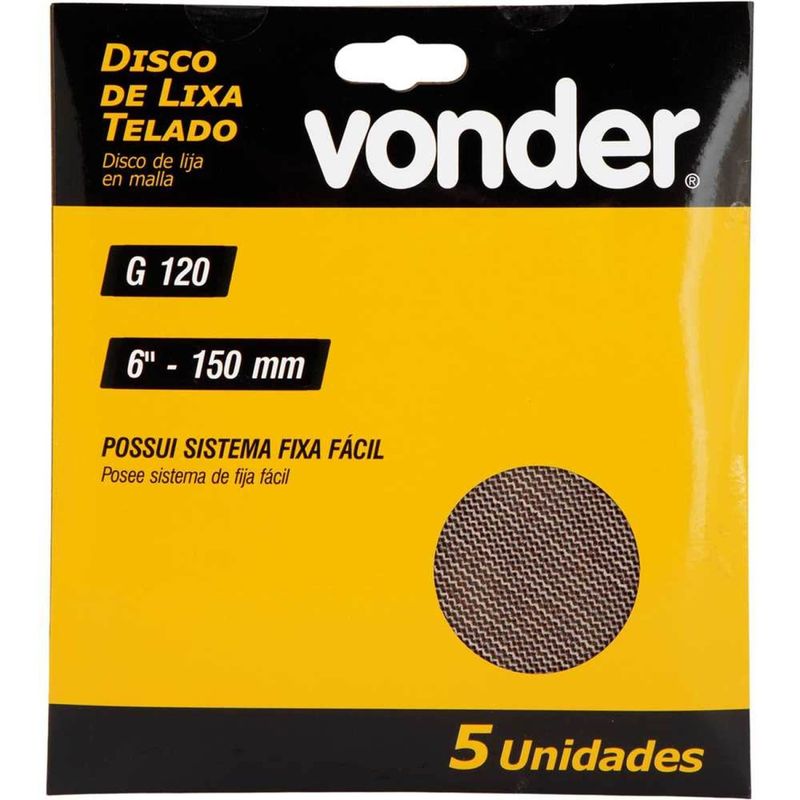 Disco de Lixa Telado, 6" - 150 mm, Grão 120, Embalagem com 5 Peças, Vonder - Conteúdo da embalagem: 5 discos de lixa. Aplicação: Ideal para lixar paredes de alvenaria, gesso, massa corrida, drywall, madeiras, plástico, metais e aplicações automotivas. Indicado para a Lixadeira Roto-Orbital LRV 350B VONDER PLUS e outras compatÃveis com o diâmetro do disco. Destaques: Tecnologia telada (abrasiva com costado aberto), maior poder de lixamento, maior durabilidade e melhor extração de pó. Possui sistema fixa fácil. Garantia - E (CDC): Garantia legal: 90 dias Referência: 1244150120 Massa aproximada (peso): 0,05 kg Grão: 120 Diâmetro do disco de lixa: 6" - 150 mm Tipo de grão abrasivo: Ãxido de alumÃnio Destaques Comercial: Tecnologia telada abrasiva com costado aberto, alto poder de lixamento, durável e com fixa fácil. Aplicação Comercial: Para lixar alvenaria, gesso, madeira, metais e mais. CompatÃvel com lixadeira Roto-Orbital LRV 350B VONDER PLUS. Características Gerais do Produto: Garantia: • 3 Meses
