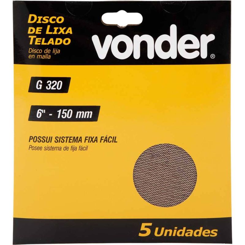 Disco de Lixa Telado, 6" - 150 mm, Grão 320, Embalagem com 5 Peças, Vonder OstenVonder - Conteúdo da embalagem: 5 discos de lixa. Aplicação: Ideal para lixar paredes de alvenaria, gesso, massa corrida, drywall, madeiras, plástico, metais e aplicações automotivas. Indicado para a Lixadeira Roto-Orbital LRV 350B VONDER PLUS e outras compatÃveis com o diâmetro do disco. Destaques: Tecnologia telada (abrasiva com costado aberto), maior poder de lixamento, maior durabilidade e melhor extração de pó. Possui sistema fixa fácil. Garantia - E (CDC): Garantia legal: 90 dias Referência: 1244150320 Massa aproximada (peso): 0,03 kg Grão: 320 Diâmetro do disco de lixa: 6" - 150 mm Tipo de grão abrasivo: Ãxido de alumÃnio Destaques Comercial: Tecnologia telada abrasiva, alto poder de lixamento, durabilidade e extração de pó. Sistema fixa fácil. Aplicação Comercial: Lixa para paredes, madeira, metais, plástico e automotivo. CompatÃvel com lixadeira Roto-Orbital LRV 350B VONDER PLUS e similares. Características Gerais do Produto: Garantia: • 3 Meses