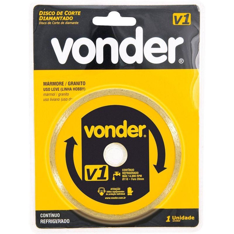 Disco Diamantado 110mm Contínuo Furo 20mm V1 VonderConteúdo da embalagem1 Disco de corte diamantadoAplicações e dicas de usoIndicado para cortar mármore, granito e cerâmicaDestaques e diferenciaisAcompanha bucha de redução de 20 mm para 16 mmDETALHES TÉCNICOSDiâmetro externo do disco de corte diamantado:110 mmDiâmetro do furo do disco de corte diamantado:20 mmRefrigeração:RefrigeradoPerfil do corte:Anel contínuoRotação máxima (rpm):14000 rpmSegue norma:ABNT NBR 15545 Produto: Disco